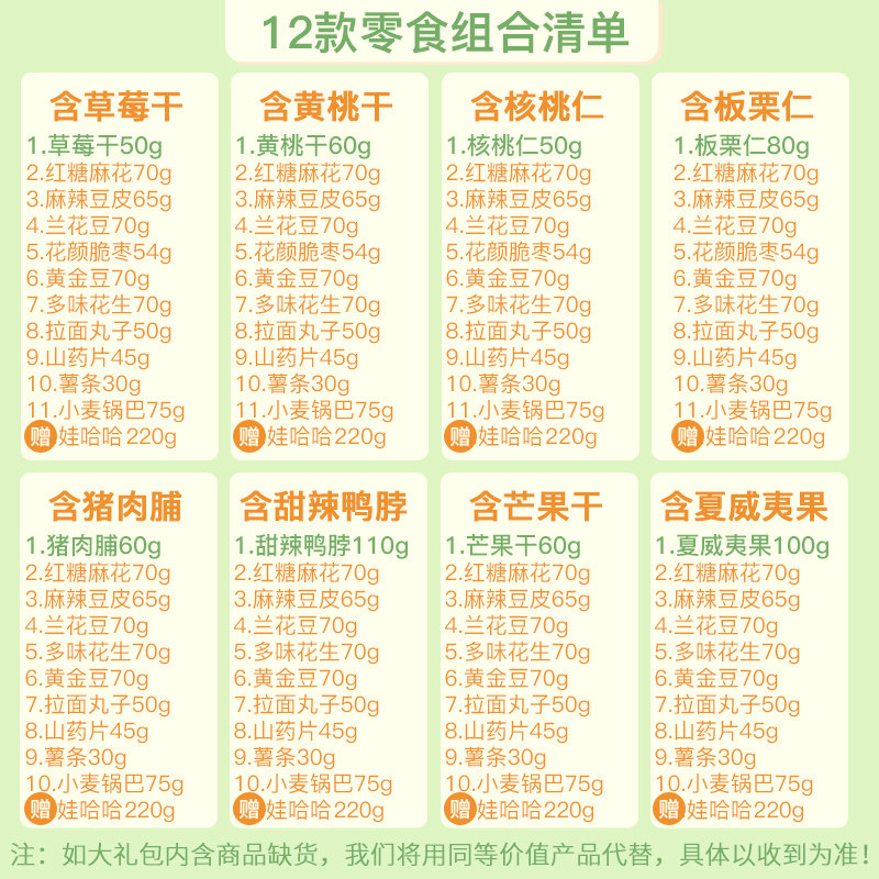 11 11 paragraphs (with pork preserved) colored boxed 11 paragraph (with sweet and spicy duck neck) color boxed 11 paragraph (with mango dry) color boxed 11 paragraph (with Hawaiian) color boxed with 12 paragraph (with strawberry)