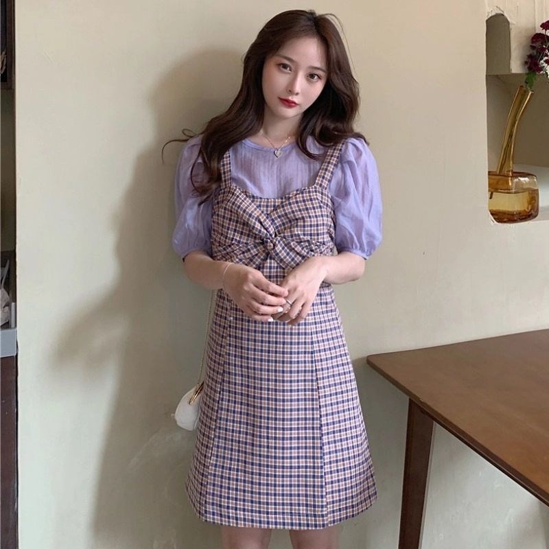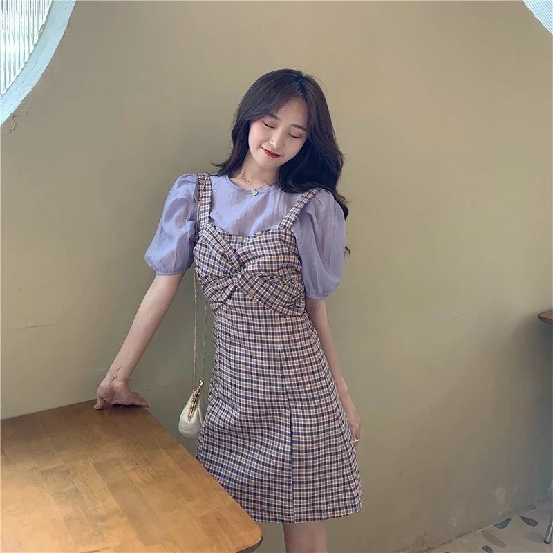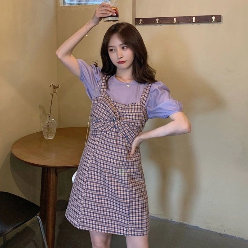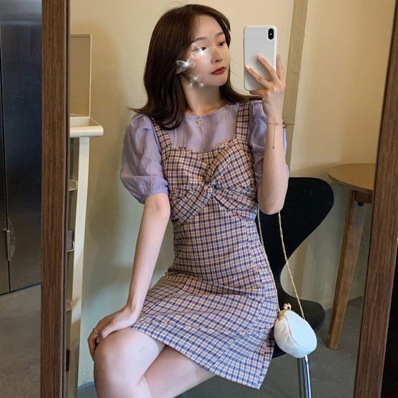 2022 new gentle purple chiffon plaid baby bag dress fake two-piece dress female summer small man