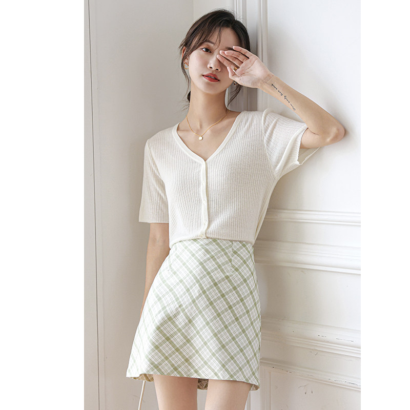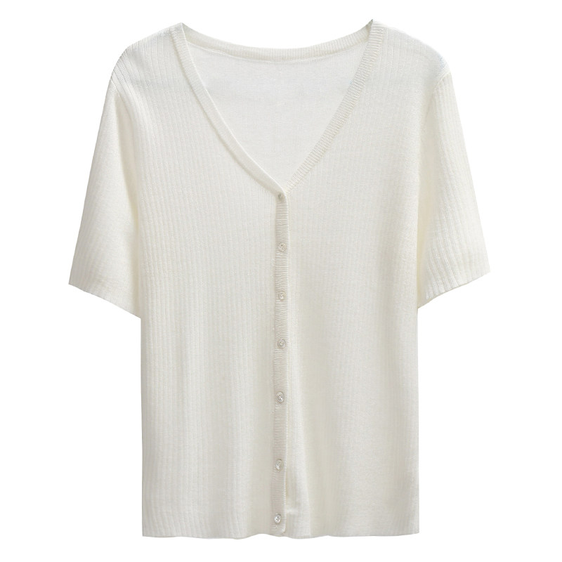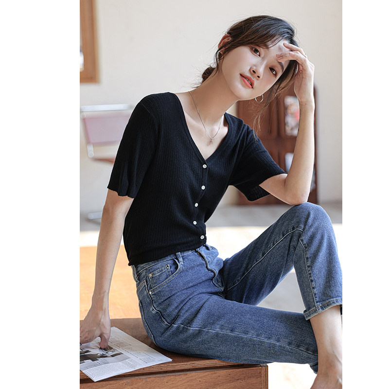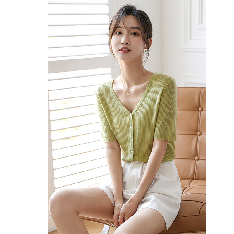 V-neck knitted short-sleeved cardigan jacket women's 2022 summer new slim thin section avocado green ice silk black and white T-shirt top
