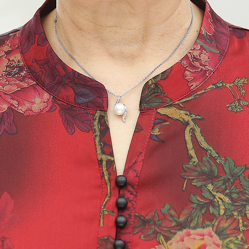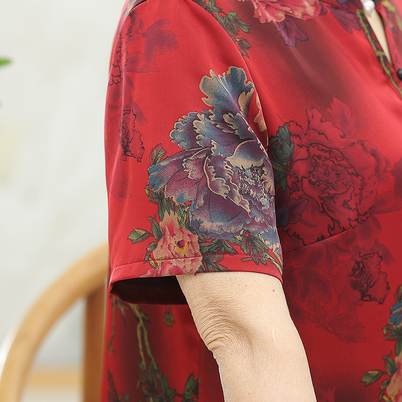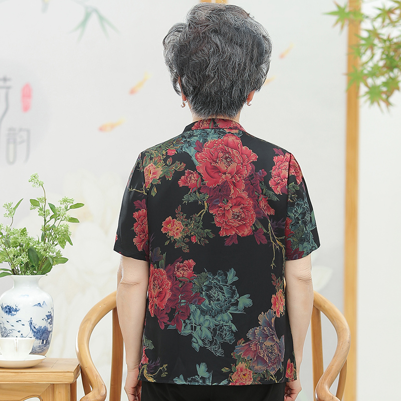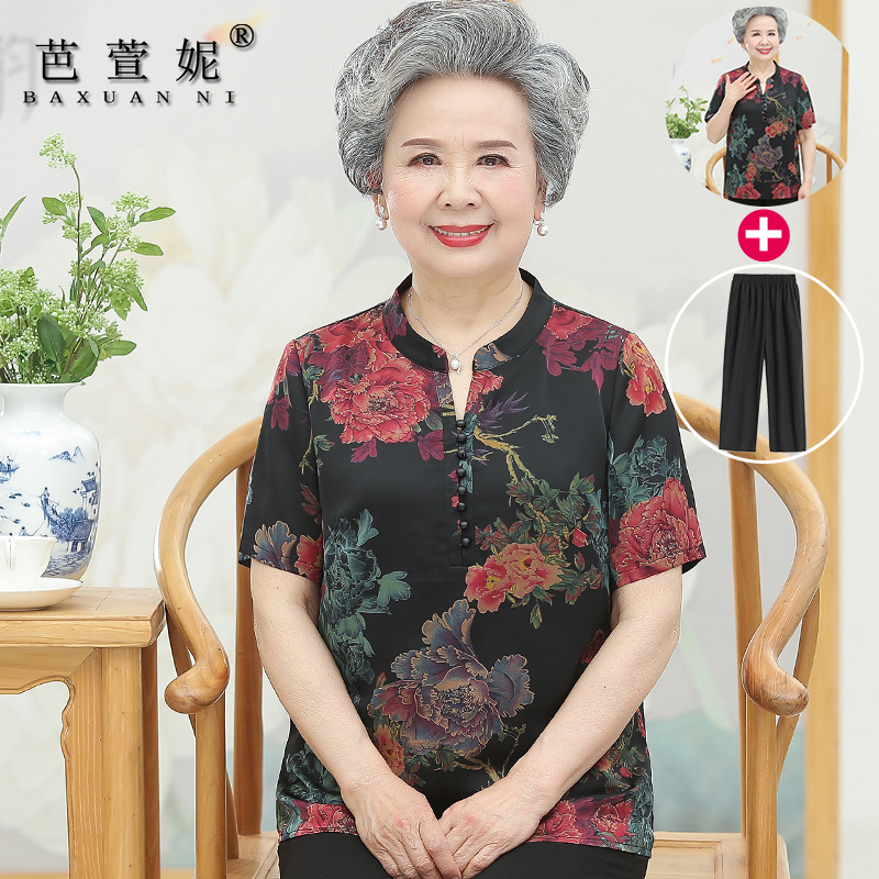 Elderly summer dress lady's grandmother suit old lady Summer real silk satin old clothes Fat mother short sleeve t-shirt