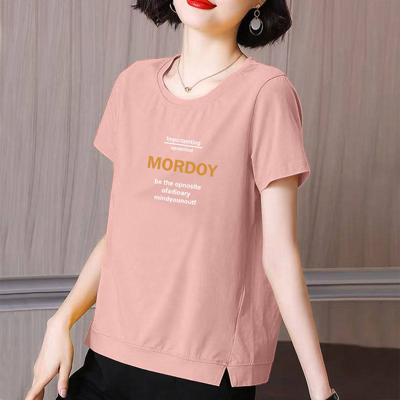 Cotton short-sleeved t-shirt women's summer new large size loose slim middle-aged mother round neck slit top women's tide