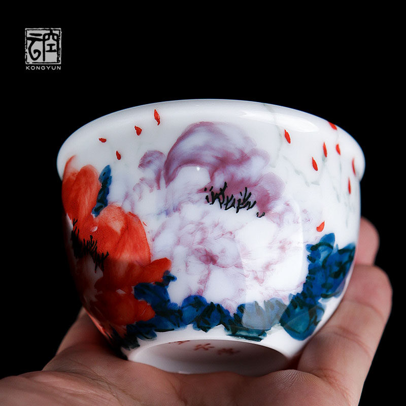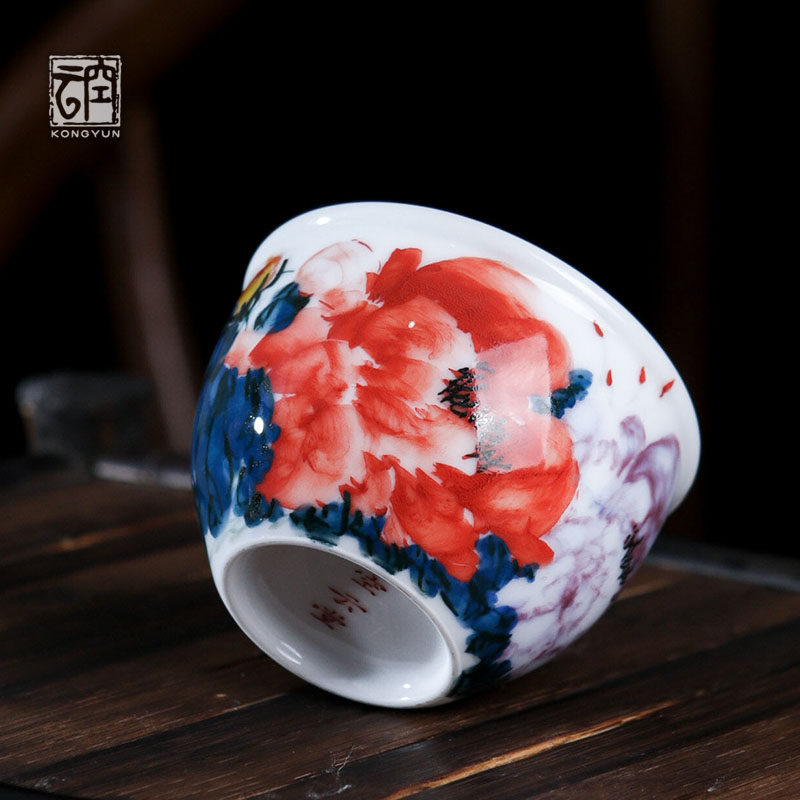 Empty cloud pure hand-painted ceramic peony master cup Jingdezhen kung fu tea cup tea cup tea set high-end tea cup cup single cup