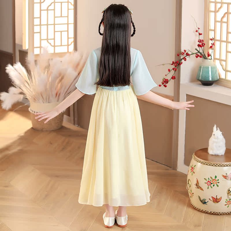 Hanfu Girls Autumn Dress Thin Section Children's Ancient Costume Green Short-sleeved Dress Super Fairy Little Girl Chinese Style Ruskirt