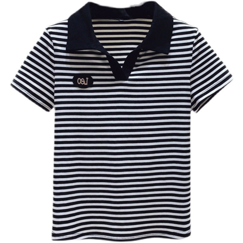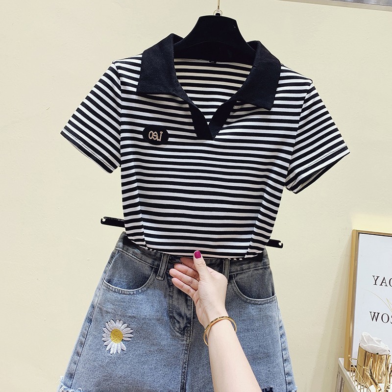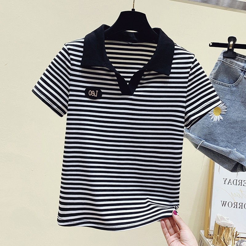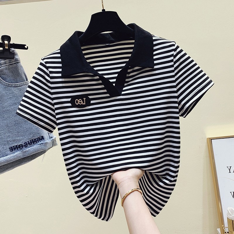 Korean cotton striped short-sleeved T-shirt women's 2022 summer new loose all-match round neck slim polo collar top