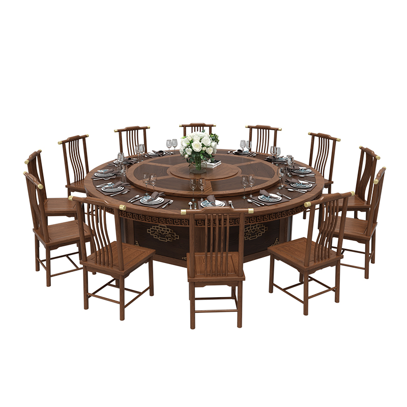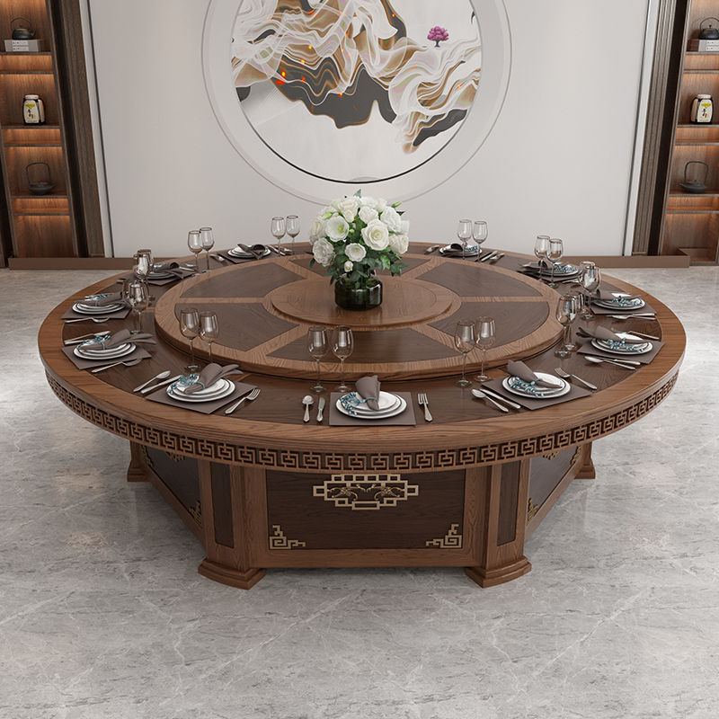 New Chinese electric solid wood turntable hotel dining table Large round table 10 people 15 people round dining table Vintage table and chair combination
