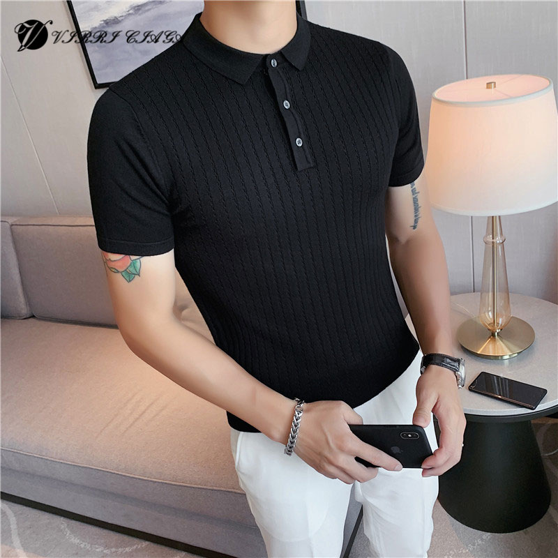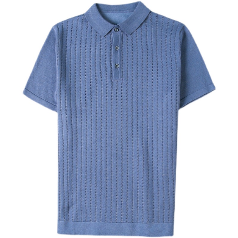 Lapel striped polo shirt men's tide brand Korean version of the slim hollow ice silk knitted sweater men's short-sleeved t-shirt thin summer