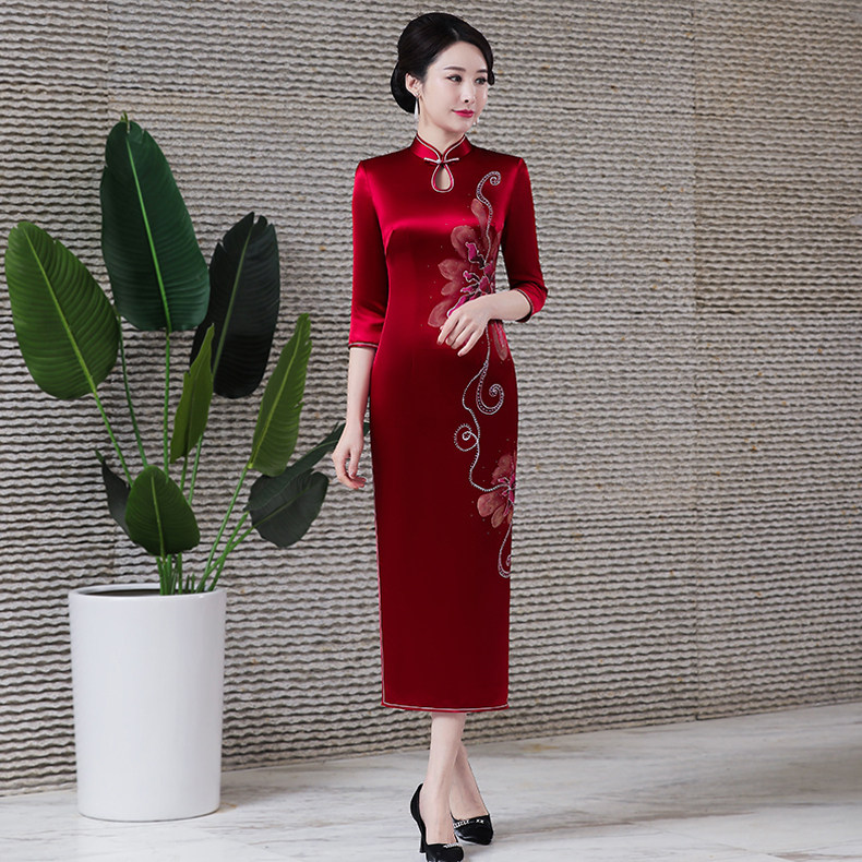 Big-name Xi mother-in-law wedding dress national style embroidery short-sleeved mid-length elegant temperament fat mother improved Chinese-style cheongsam