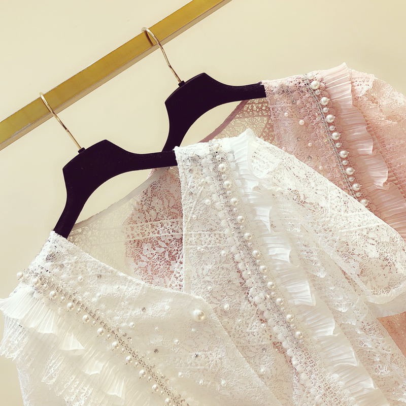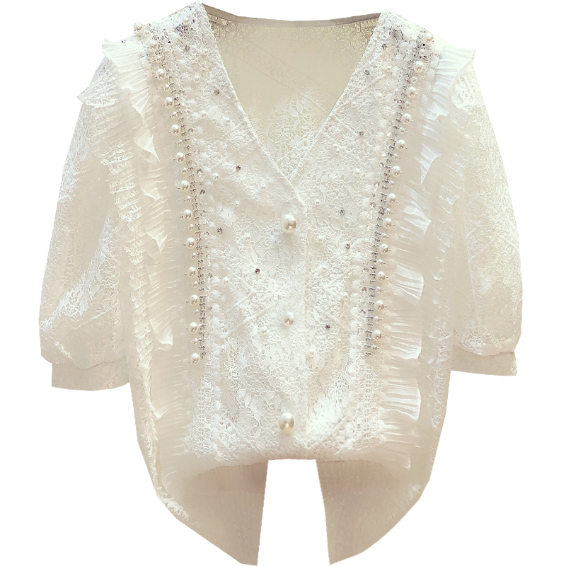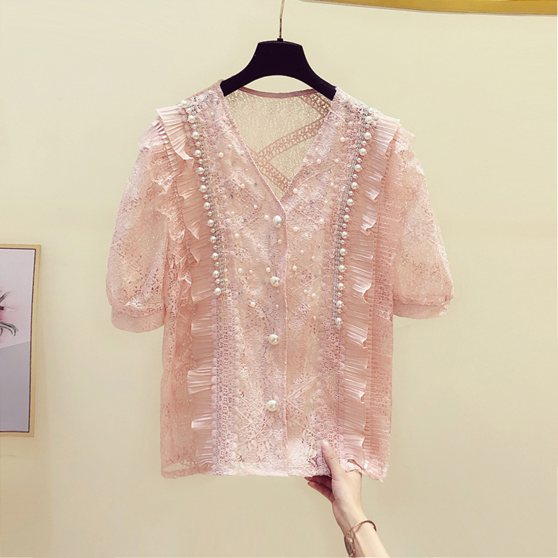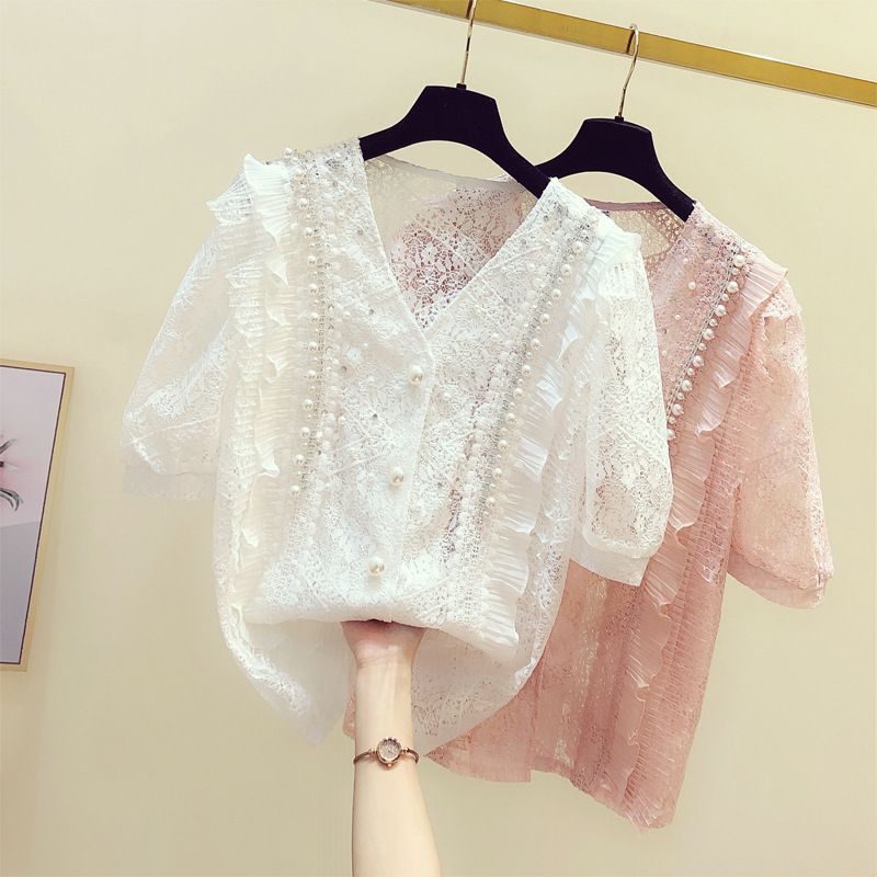 Tide card French style sweet and mermaid lace hollowed-out V collar shirt woman 2022 Summer new Korean version Short sleeve snow-spinning shirt