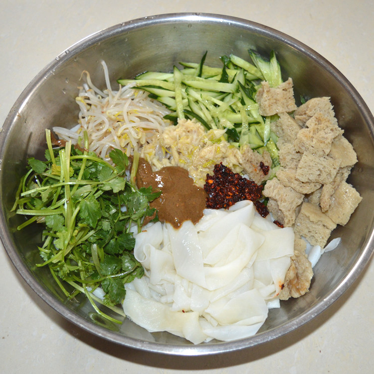 2 pounds of dry noodles, soaked in cold water for 10 minutes, 2 pounds of dried noodles, 1 package of cold seasoning (enough) 2 pounds of dried noodles, 1 package of sesame paste, 100 grams of 2 pounds of dried noodles, 150 grams of noodles