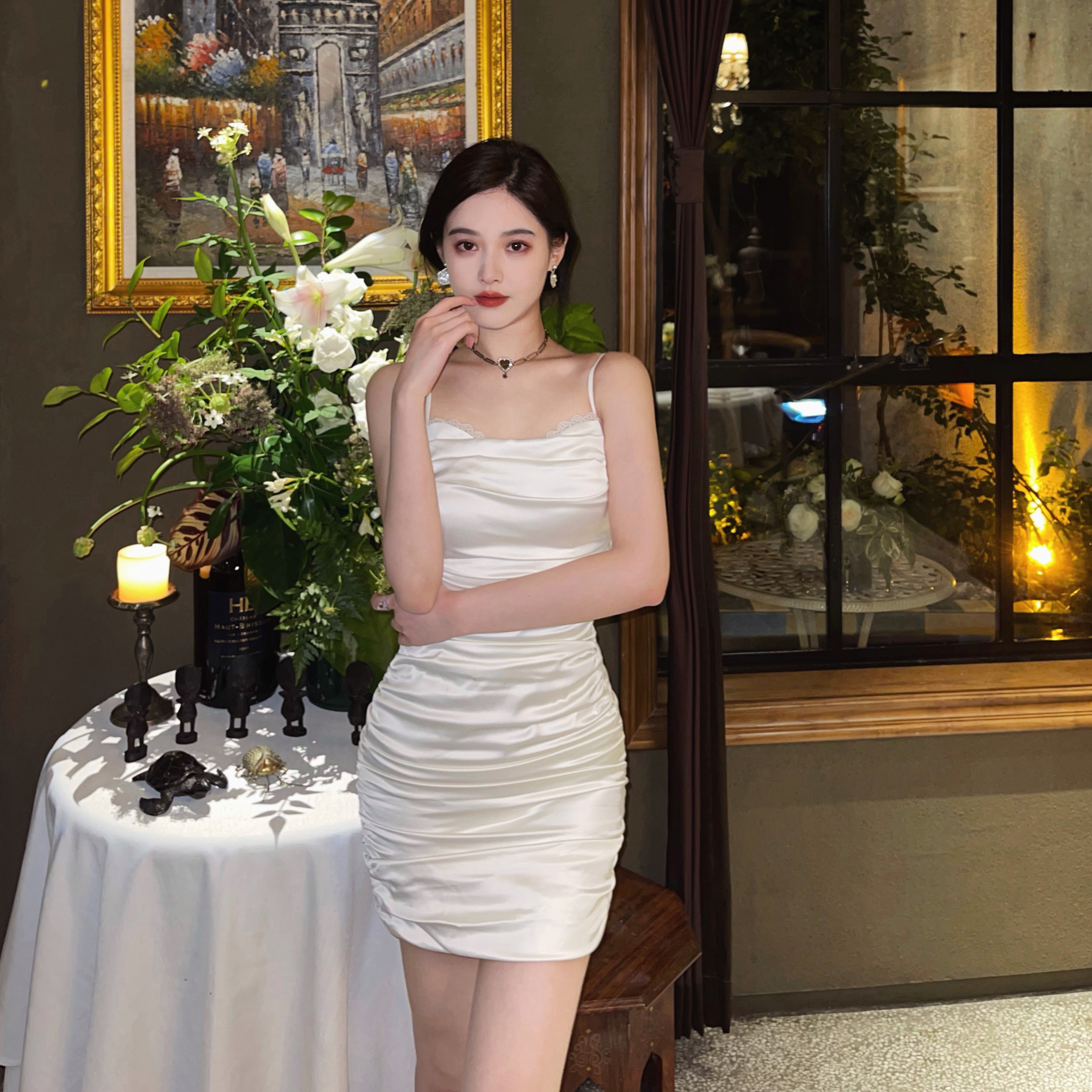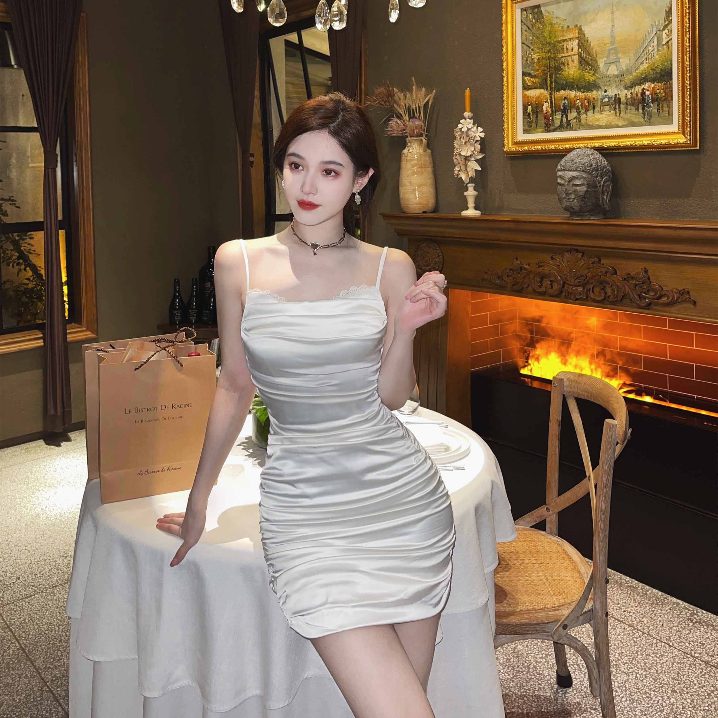 nicky lace sling dress female spring and autumn hot girl pure color gentle wind French first love sweet temperament waist