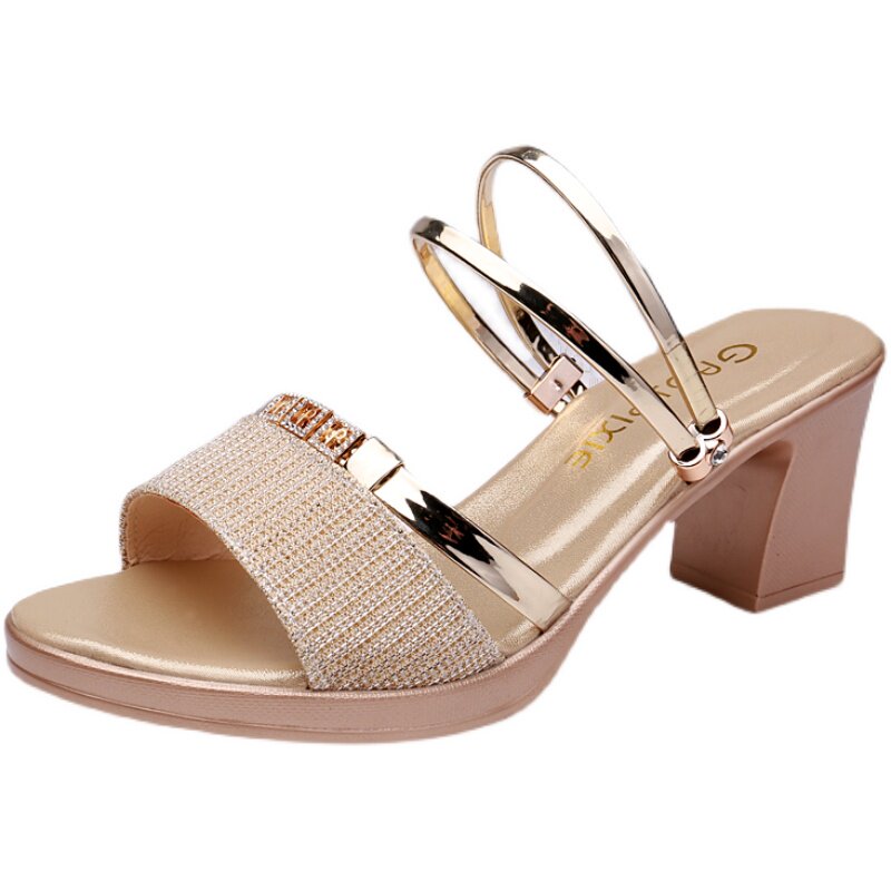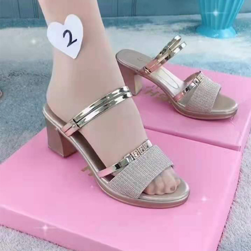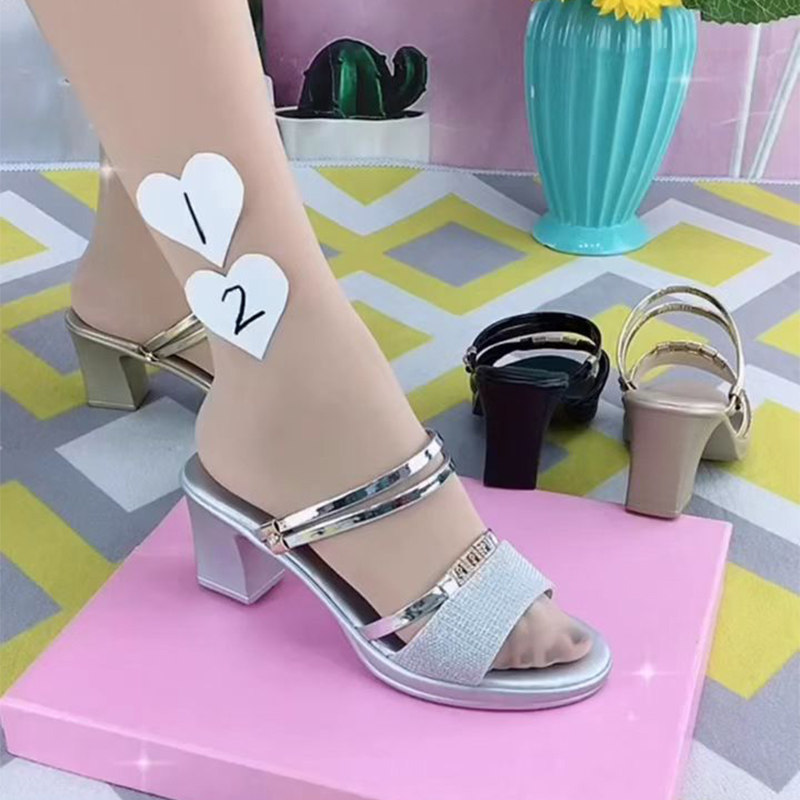 Leather mid-heel sandals women's outerwear 2022 summer new two-wear sequined sandals thick heel fish mouth all-match fashion slippers