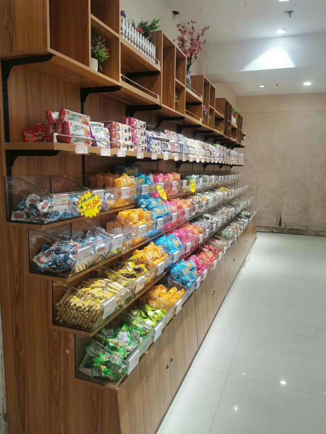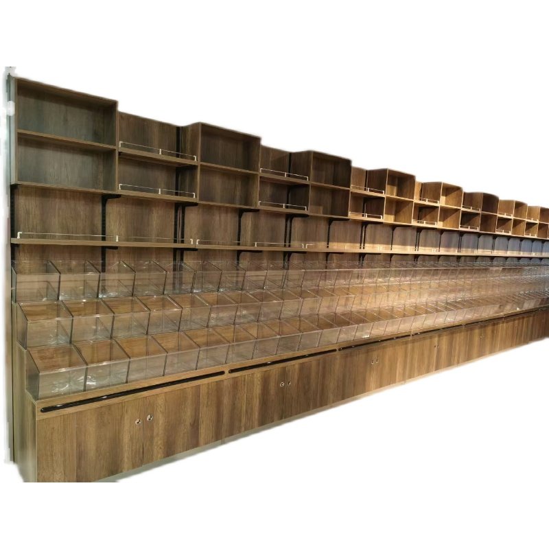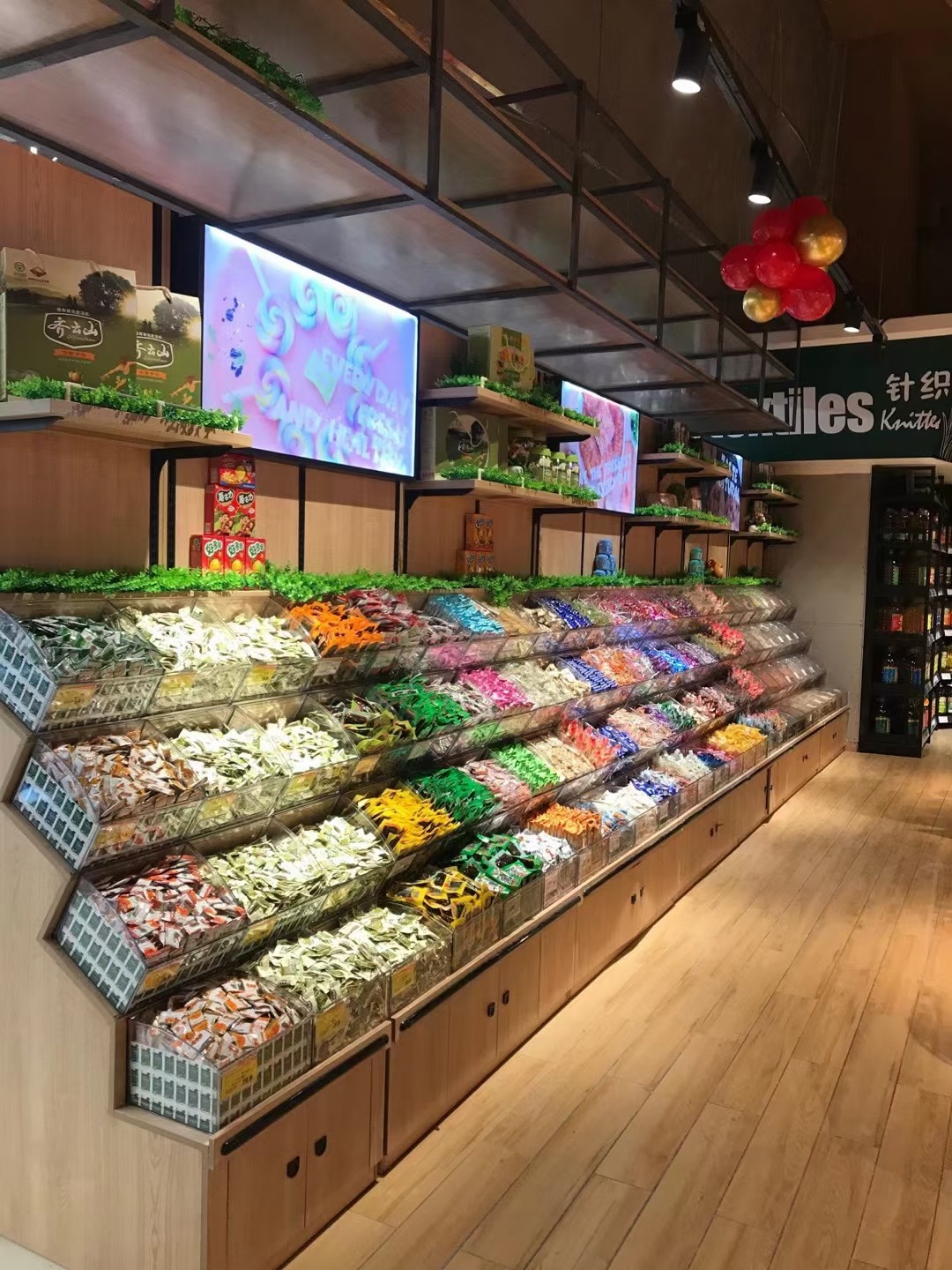 Supermarket dried fruit shelves against the wall steel wood combined with bulk snacks whole grains candy cabinet rice noodle egg rack roasted seeds and nuts