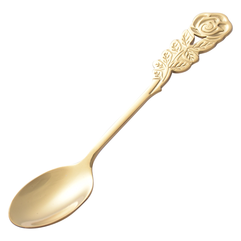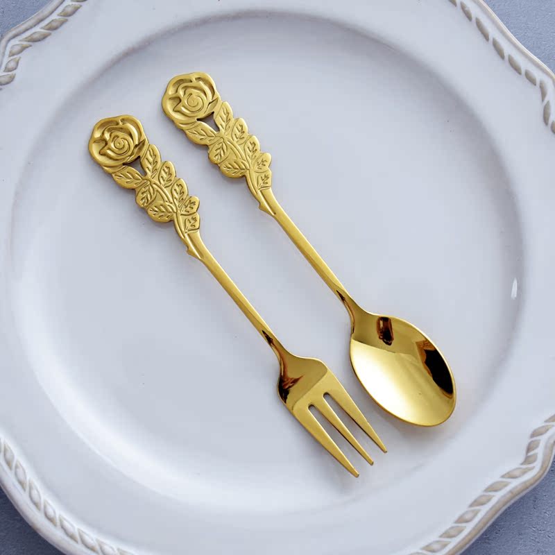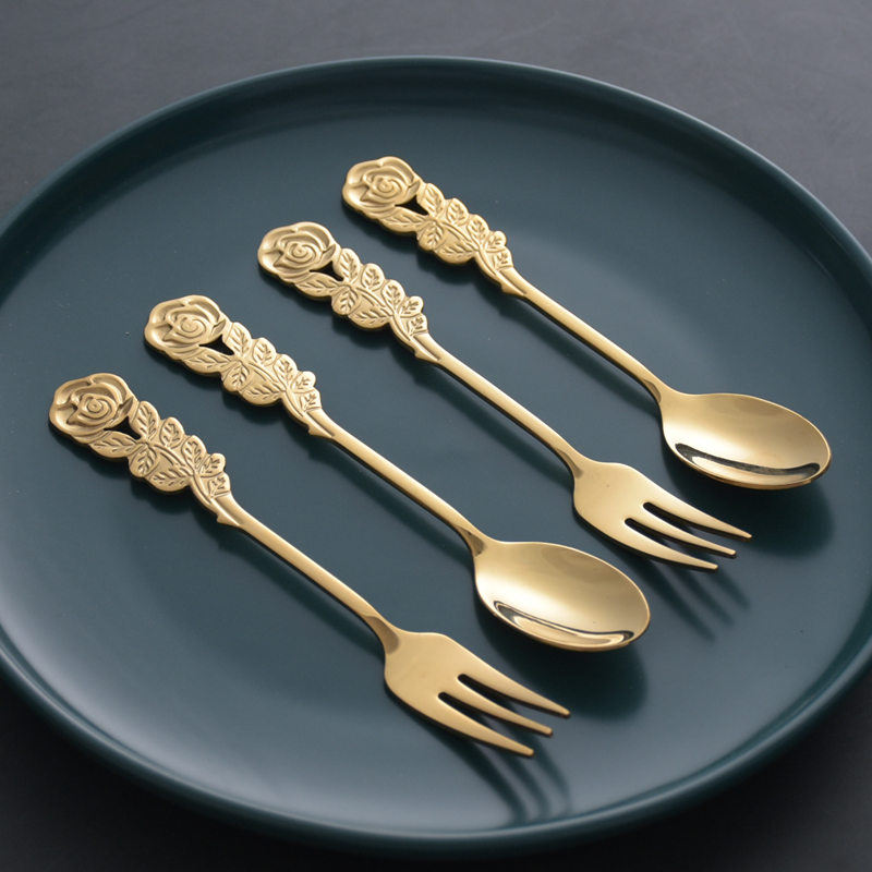 304 Stainless Steel Home Light Lavish Golden Coffee Stirring Spoon Three Teeth Cake Fork Cake Fork Rose Handle Cold Drink Spoon