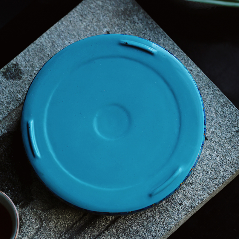 Fuji Large Paint Blue Kettle with a green disc on red wood Chinese tea plate plate furnace 1297