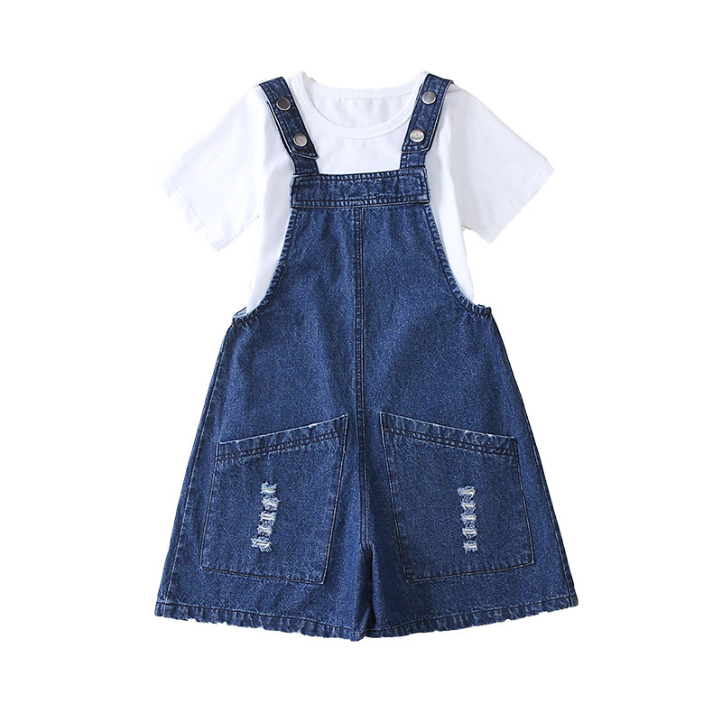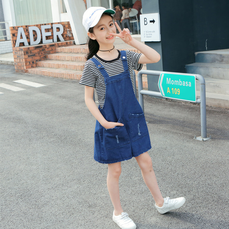 Girls summer denim baby bag pants suit new Korean version of the big children's suspenders wide-leg pants loose two-piece set