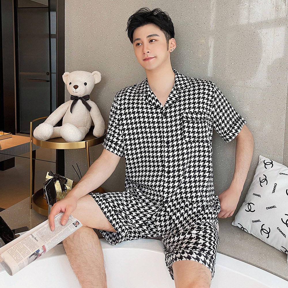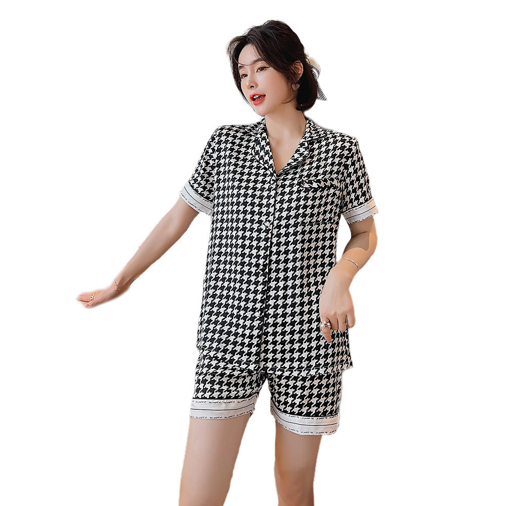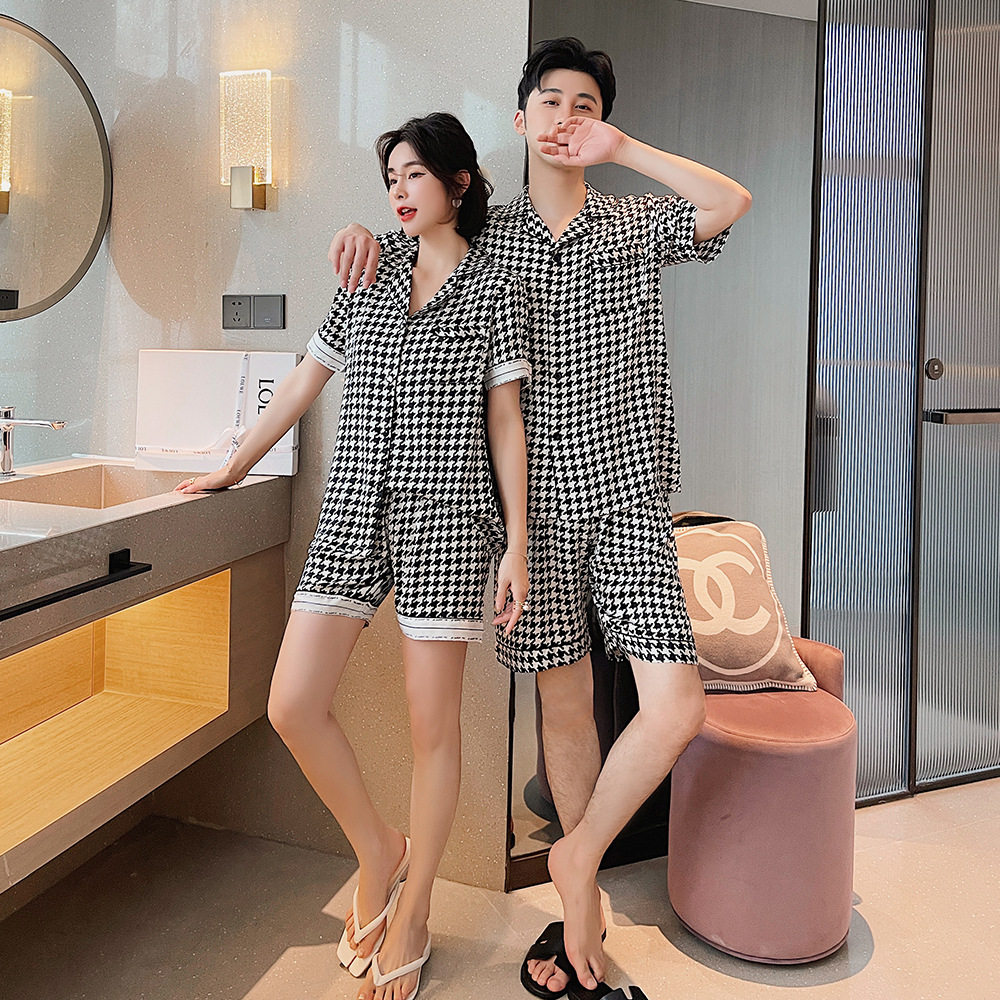 Lovers pyjamas 2022 Summer new silk Thousand Birds lattice Short sleeves Men and women Loose Casual Fashion Home Suit IB