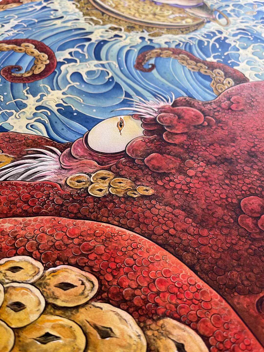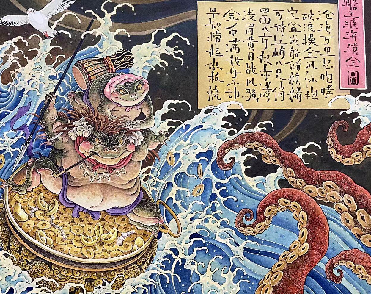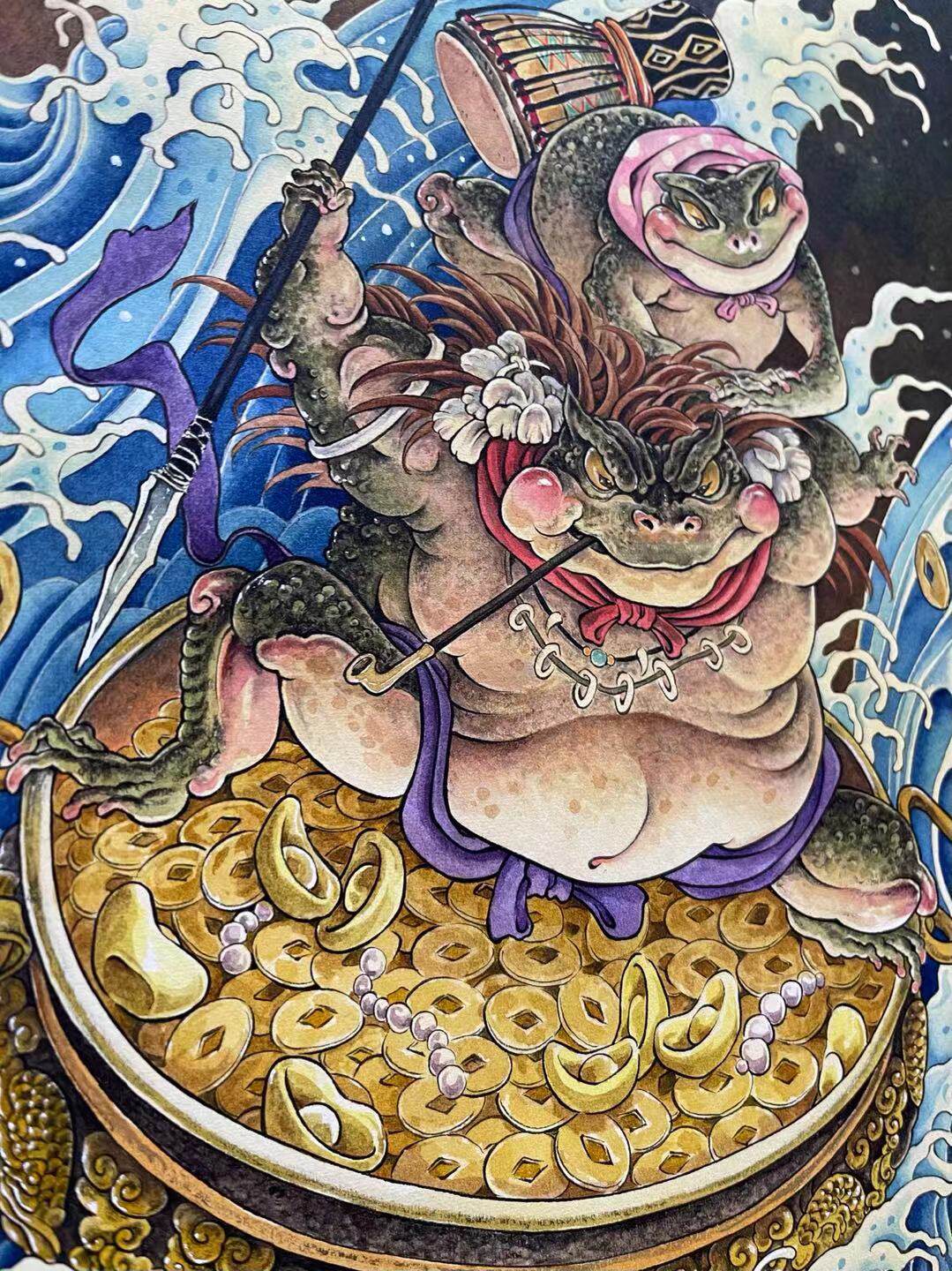 Scum Bear Original Zen toad Artistic Micro Spray Decoration Painting Toad King Cross Sea Touch Golden Picture Red Beech Wood Frame