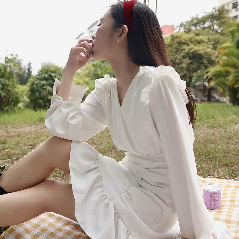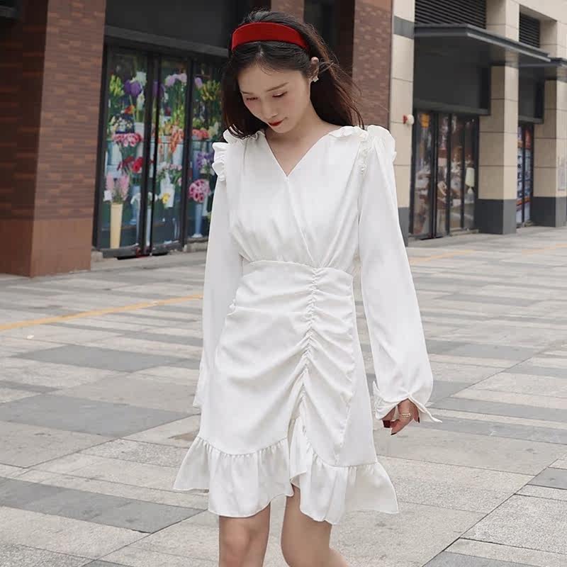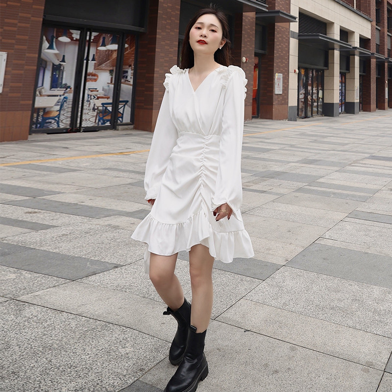 Small pleated irregular dress female 2021 New French belly thin V collar temperament long sleeve skirt
