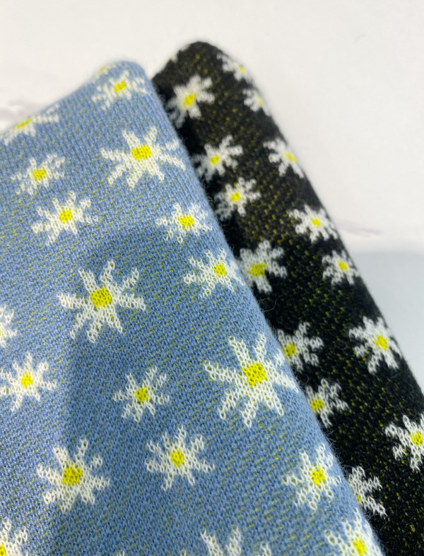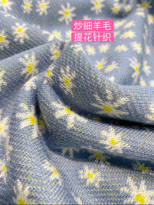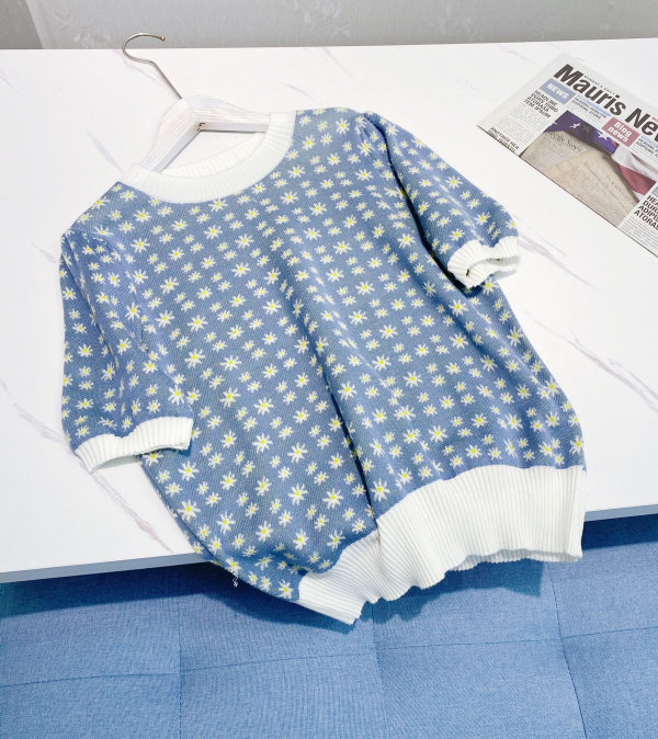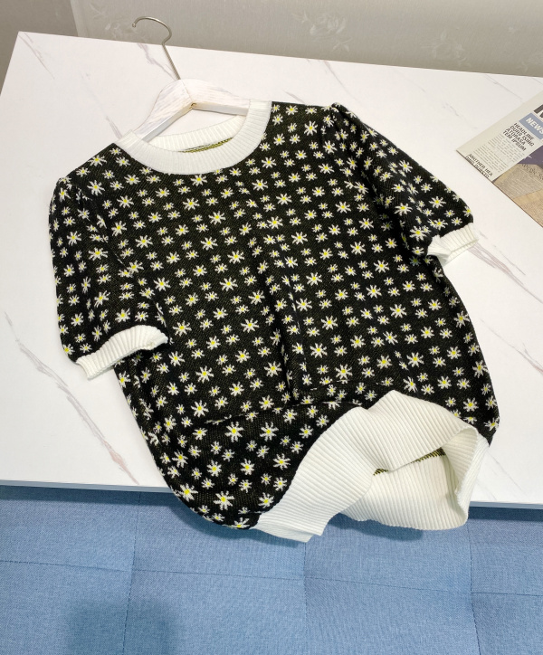2021 summer new short section Round Collar Bubble Cuff Jacquard Knit Small Daisy Stir-fry Fine Wool Knit T-shirt Woman
