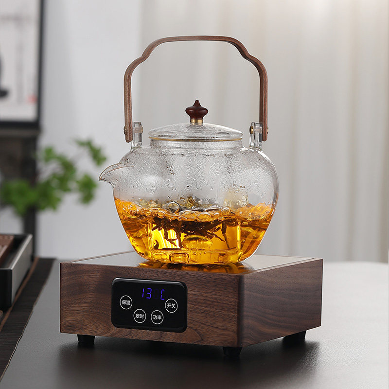 Walnut wide mouth pot with silver a walnut width kut 1000ML (double inner bile) wood grain stove Send 4 teacups Walnut width kut 1000ML (double inner bile) small white round stove