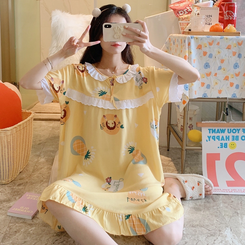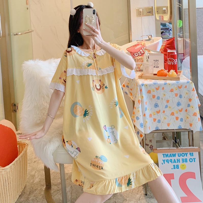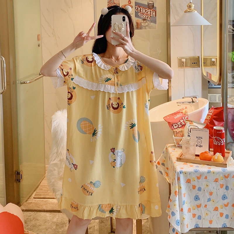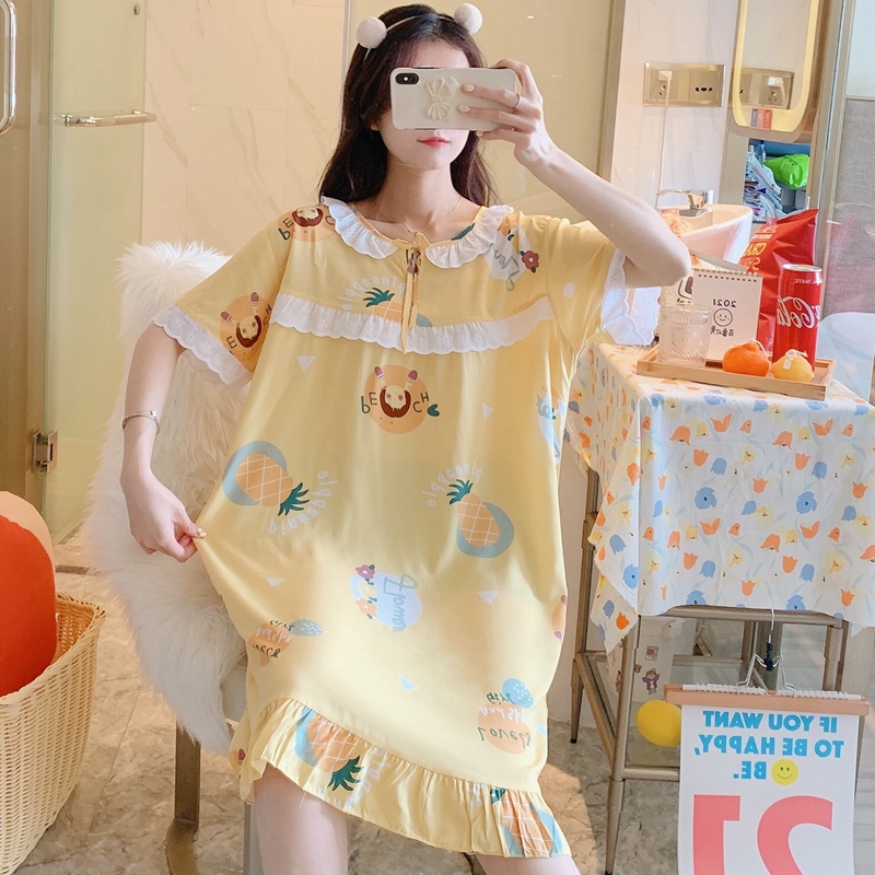 Short Sleeve Sleeping Dress Woman Summer Cotton Silk Sleeping Dress Cotton Silk Sleeping Dress Artificial Cotton Dress Thin with big code palace Princess Wind-Taobao