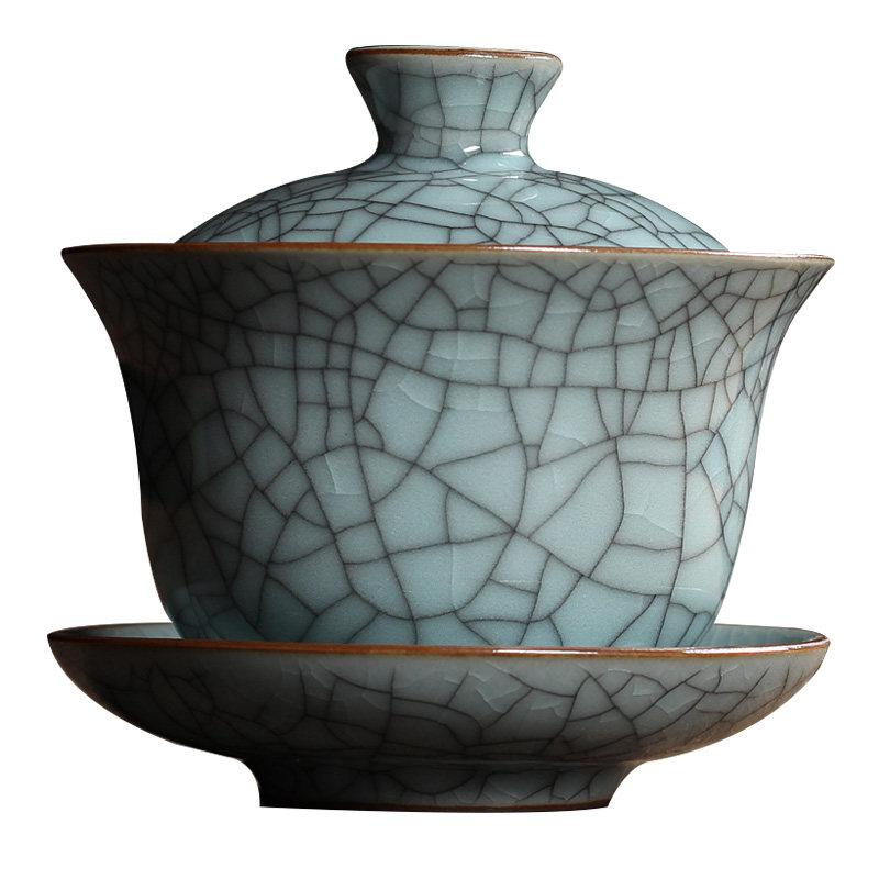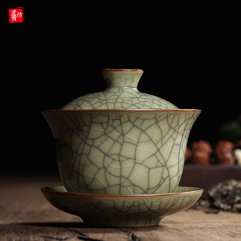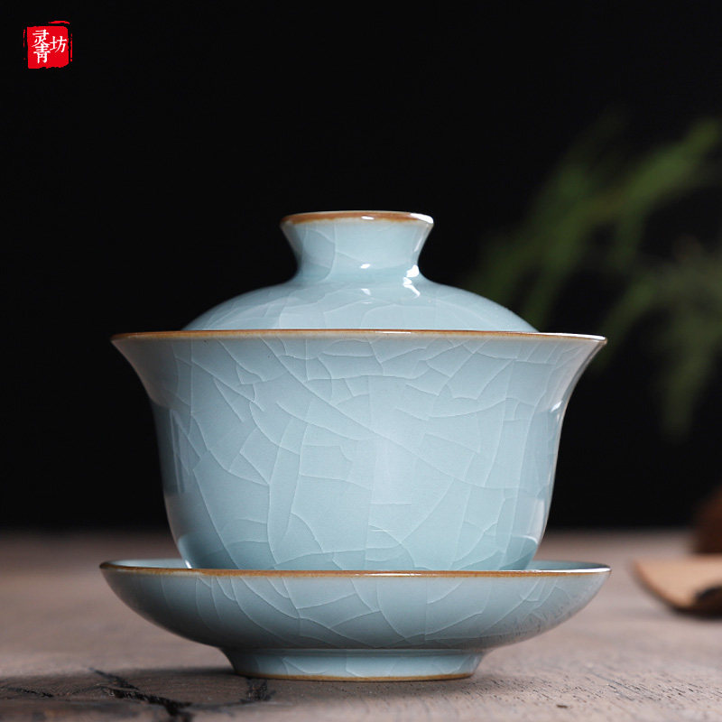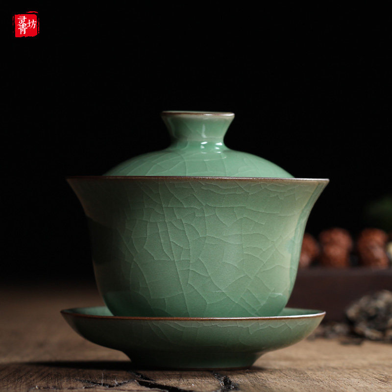 Celadon three Cai-covered bowl tea cup Single ceramic Gongfu tea with large tea bowl Household Longquan Ge kiln ice crack