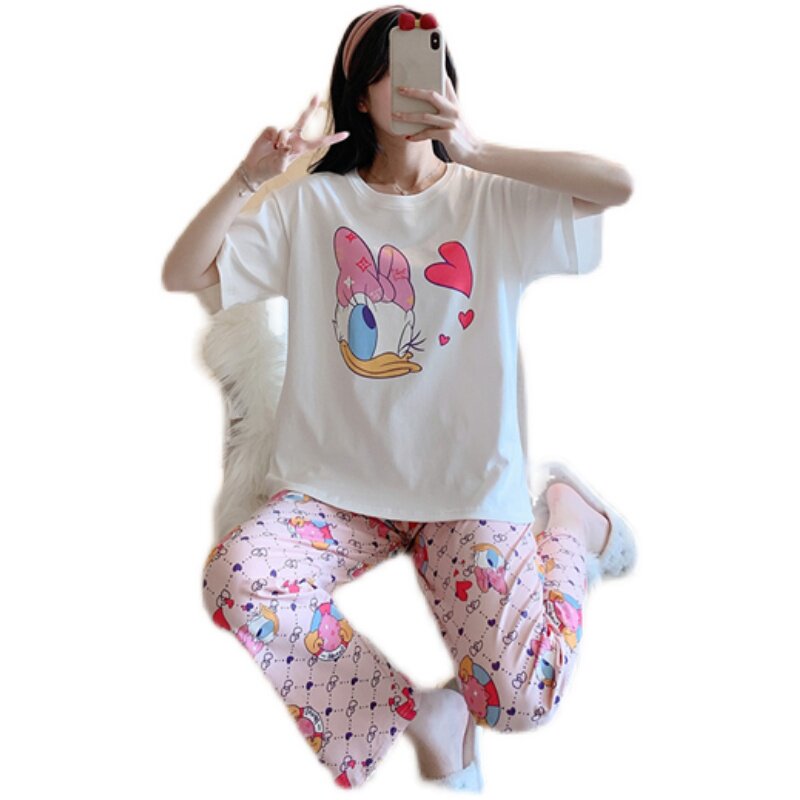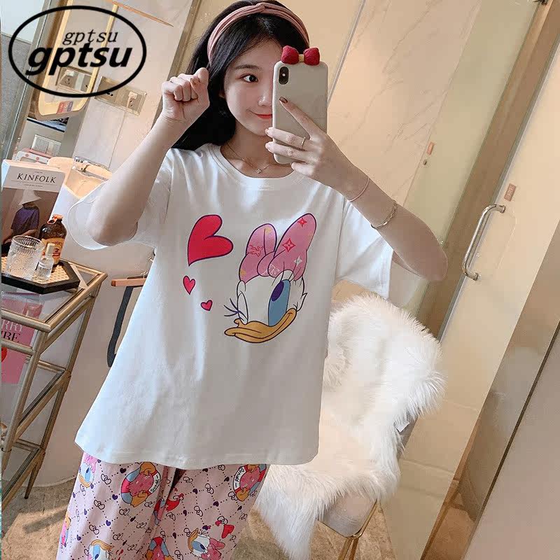 Japan Gp Pajamas Woman Summer Pure Cotton Short Sleeve Long Pants Cute Cartoon Round Collar Can Outwear Home Suit Suit