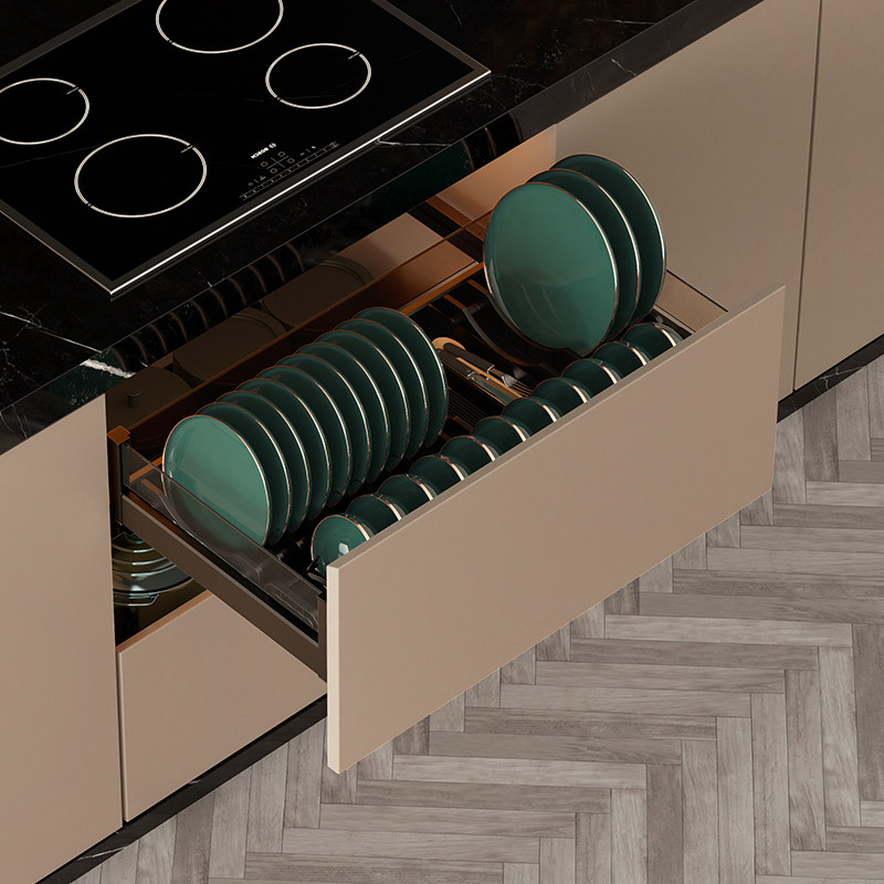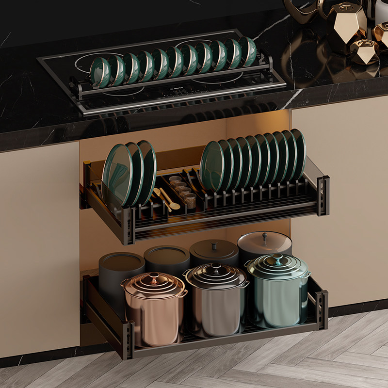 kitchentime kitchen whole cabinet double drawer Star series Black Crystal all aluminum gold dishes pull basket