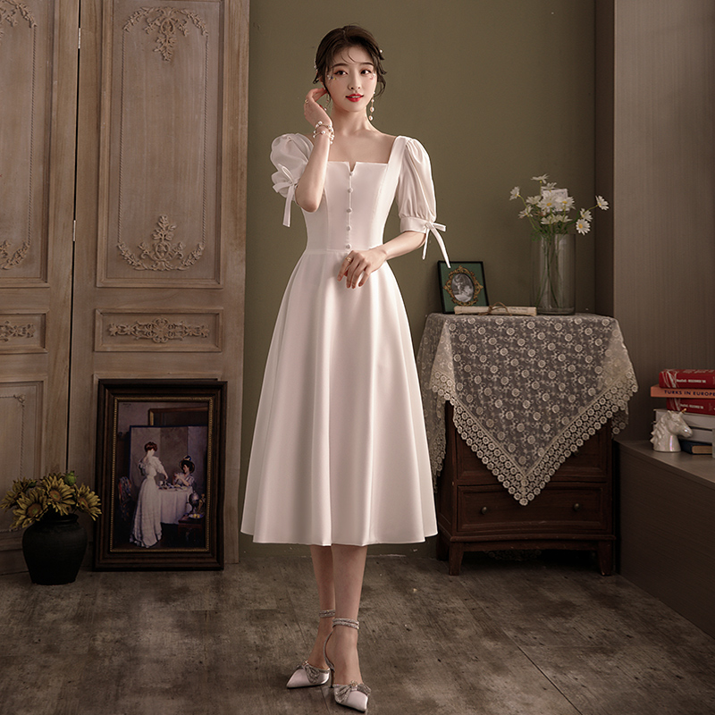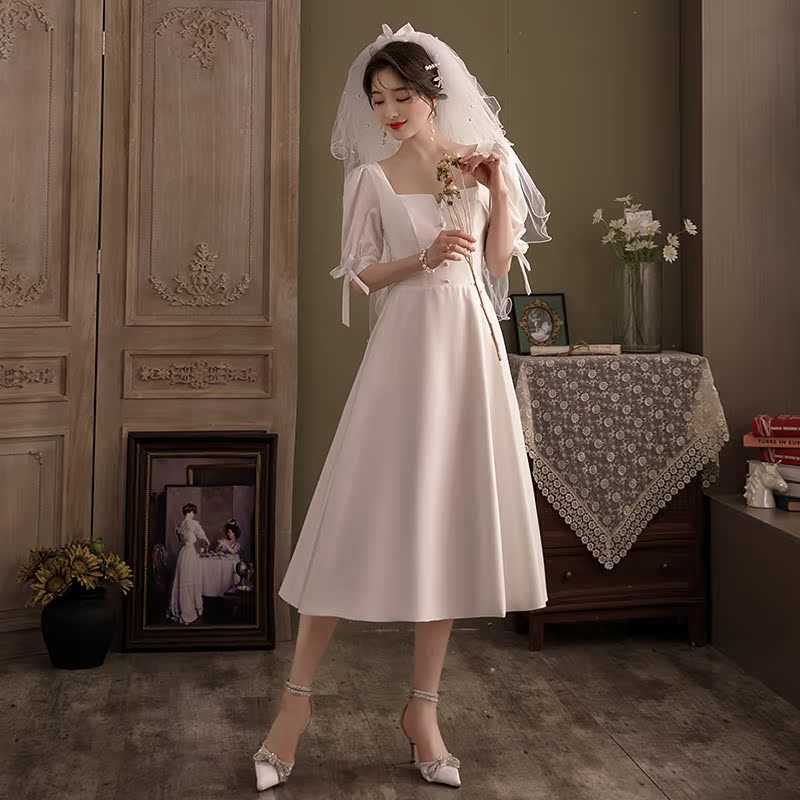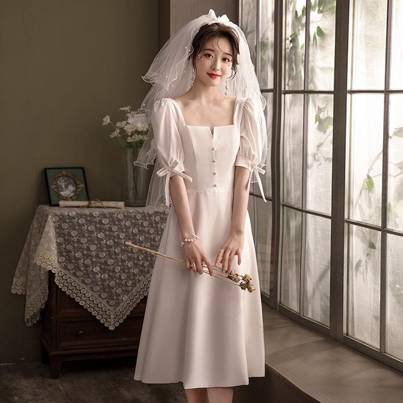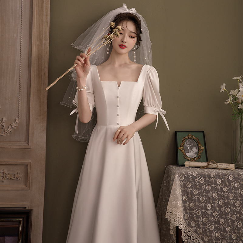 Satin light wedding dress Simple French retro dress Travel super fairy Sen white dress collar card registration small dress