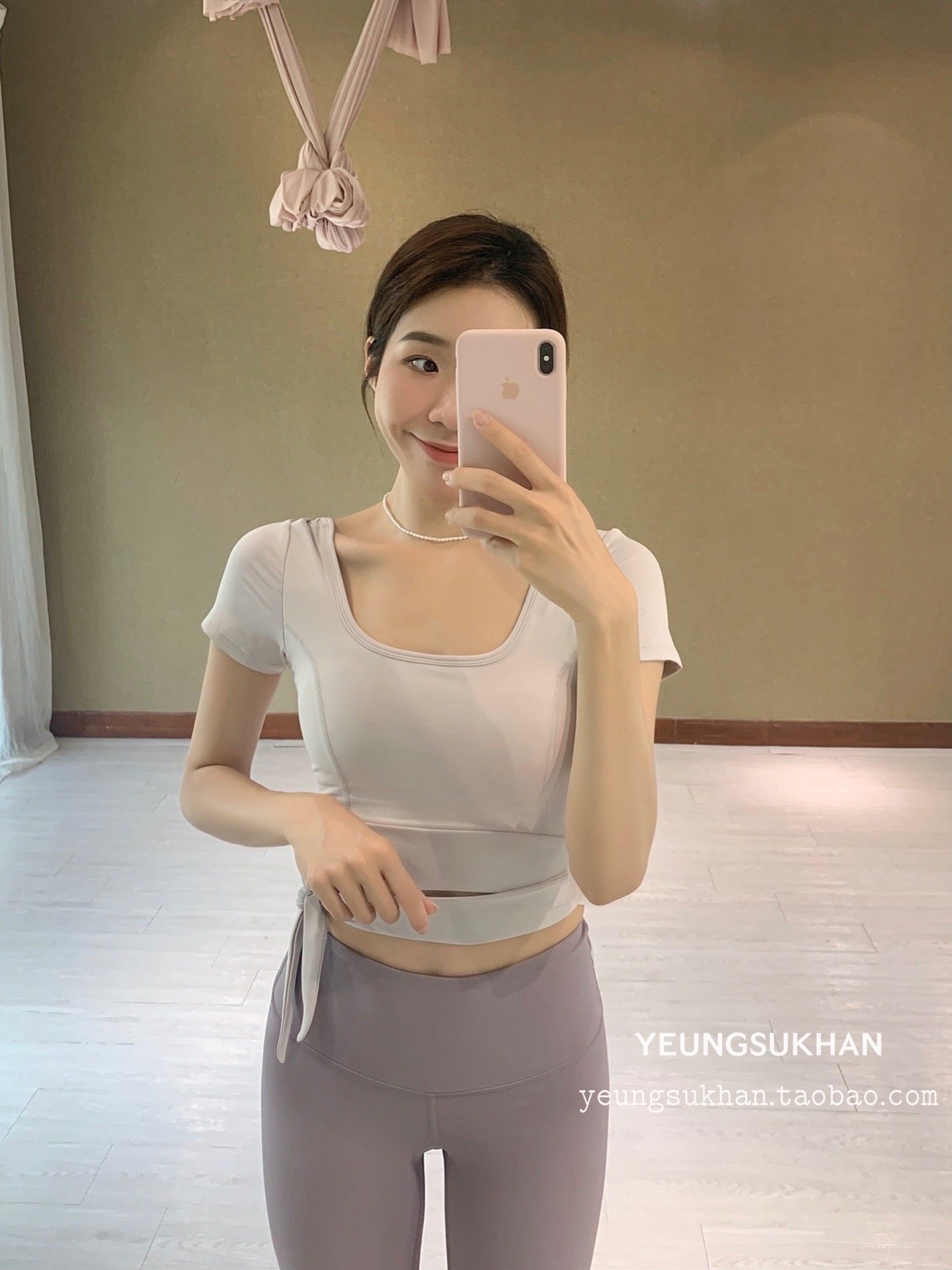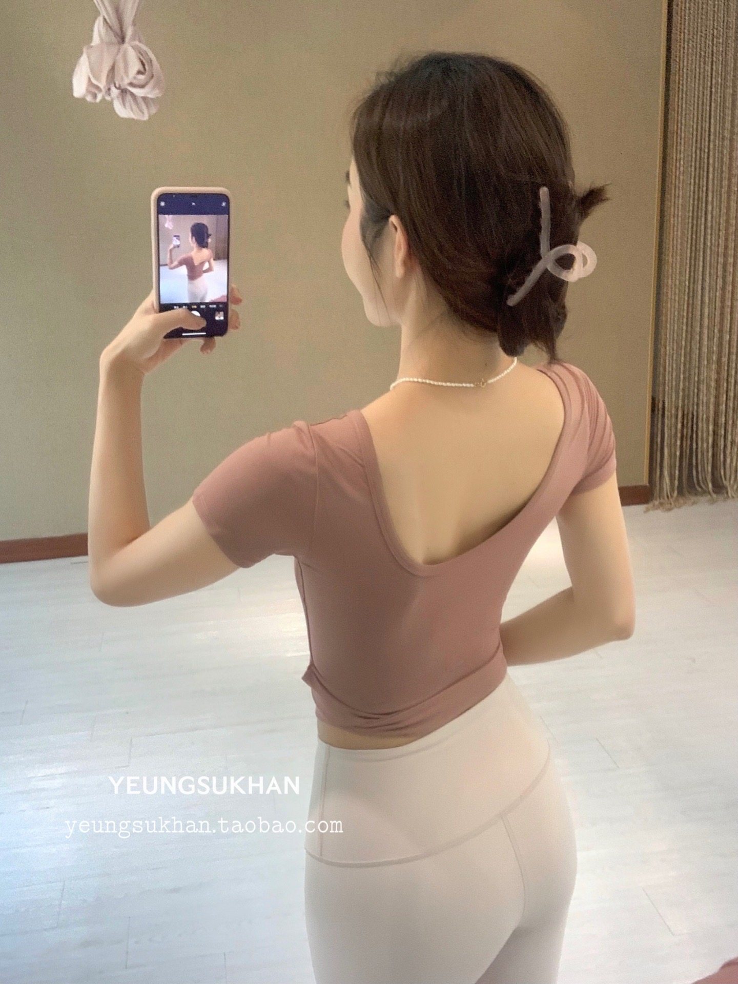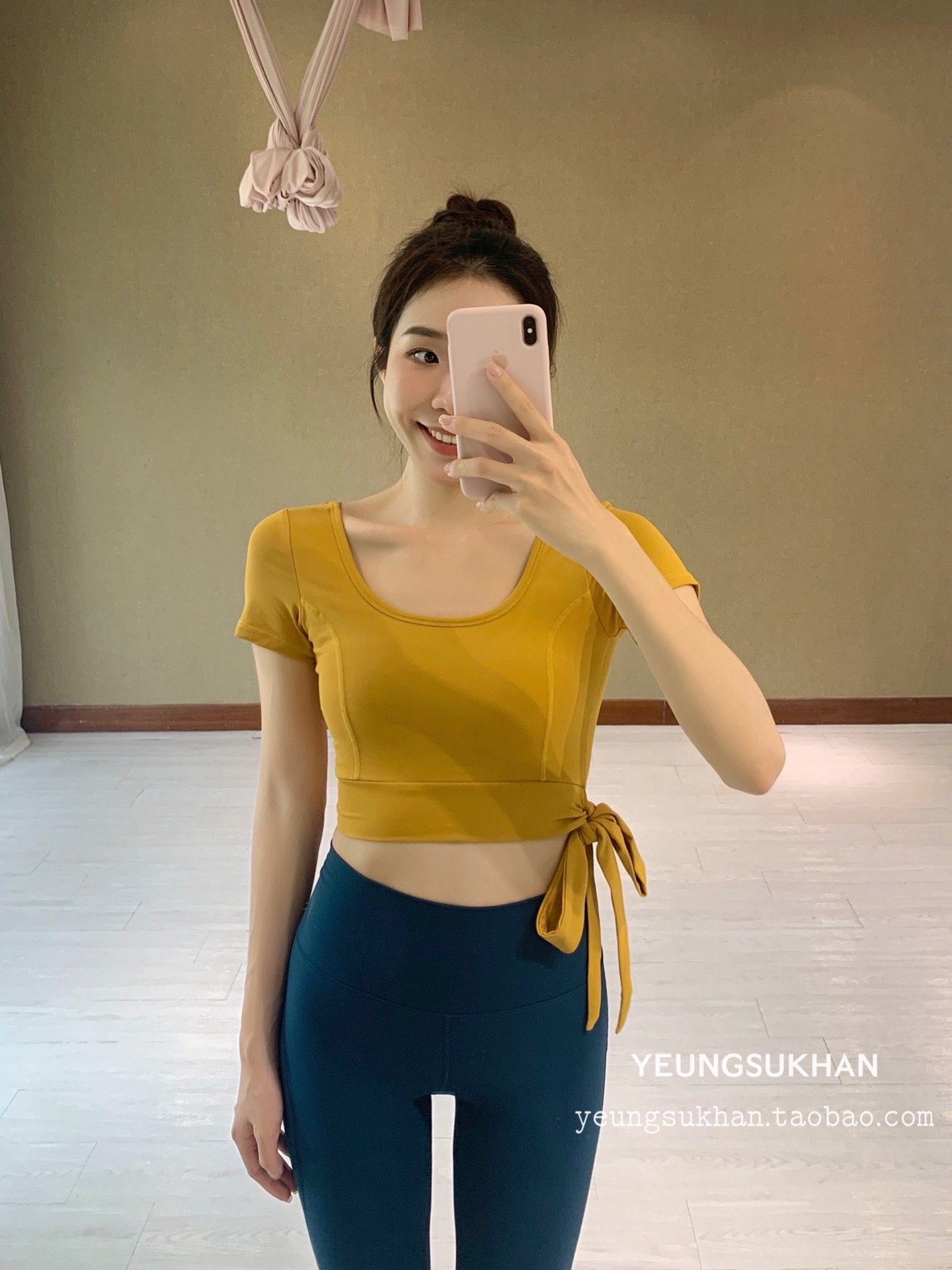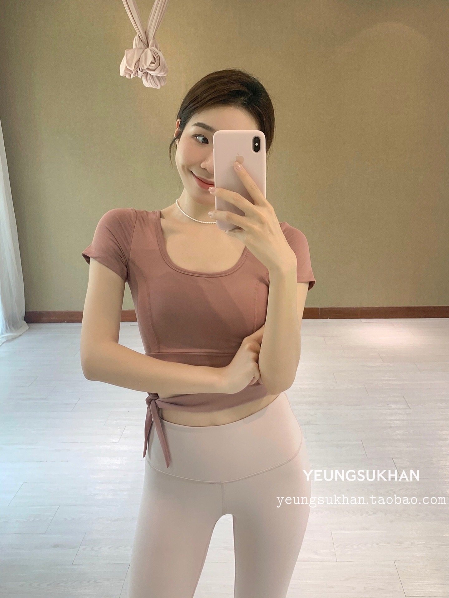 YEUNGSUKHAN Streamer Yoga Short Sleeves Breast Pad Slim Strap Yoga Dress Women Running Fitness T-Shirt