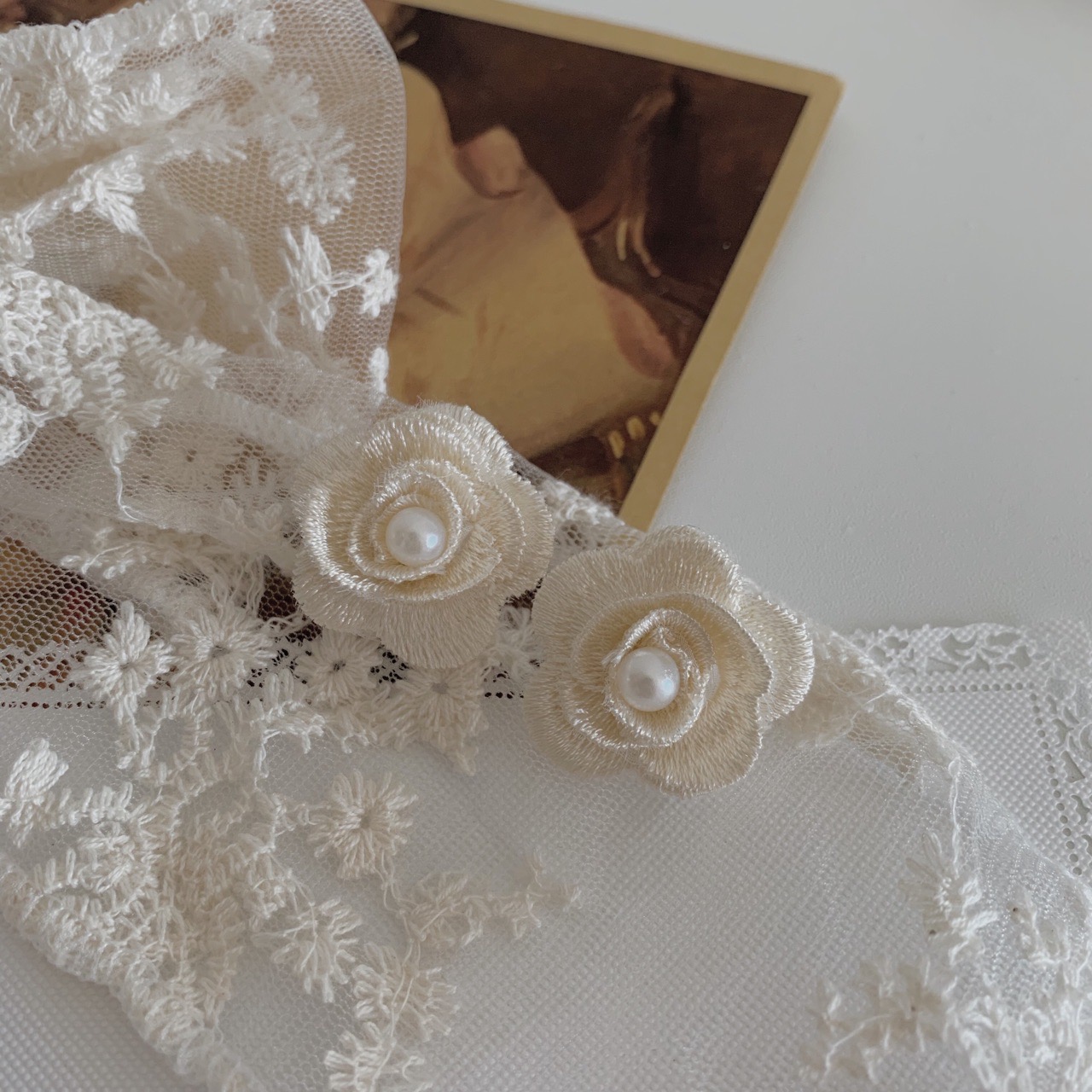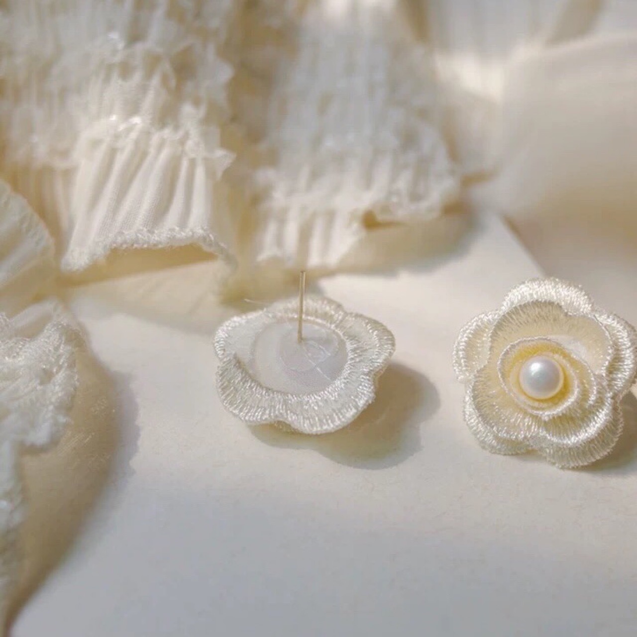 Korean embroidered lace White Rose Day freshwater pearl earrings retro elegant Camellia earrings female