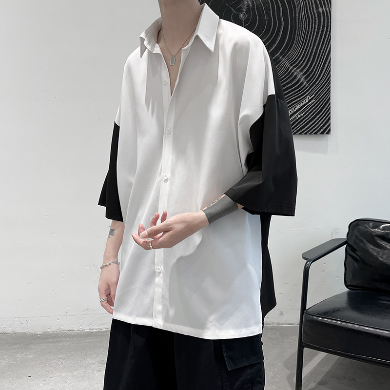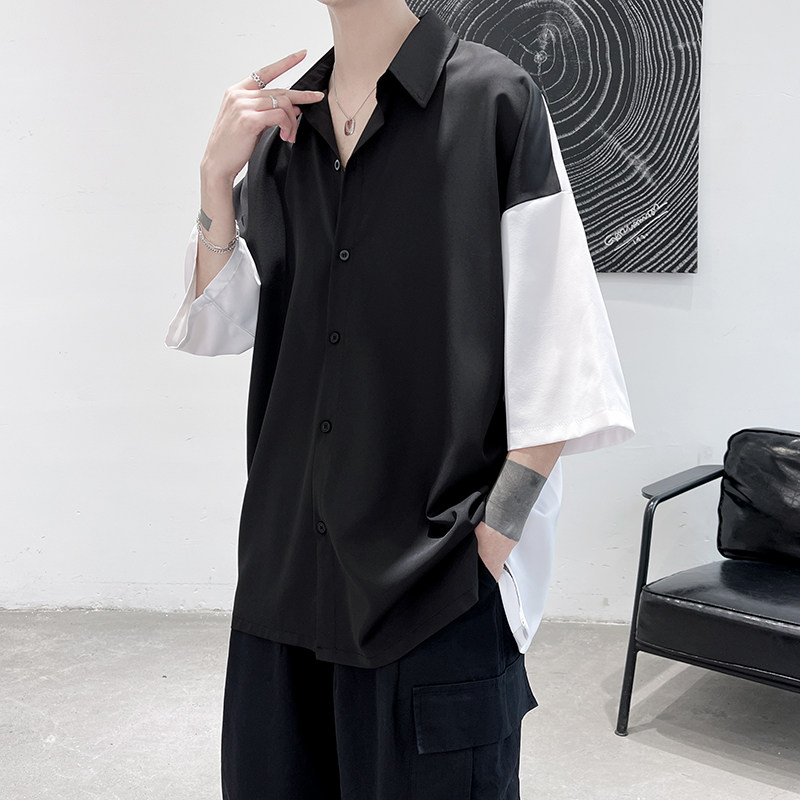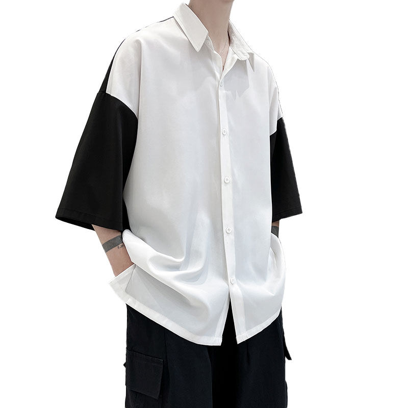 Summer Hong Kong style Japanese blue and white stitching ice silk shirt men's short-sleeved loose casual ruffian handsome shirt trend jacket men