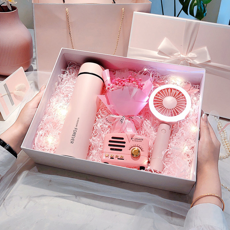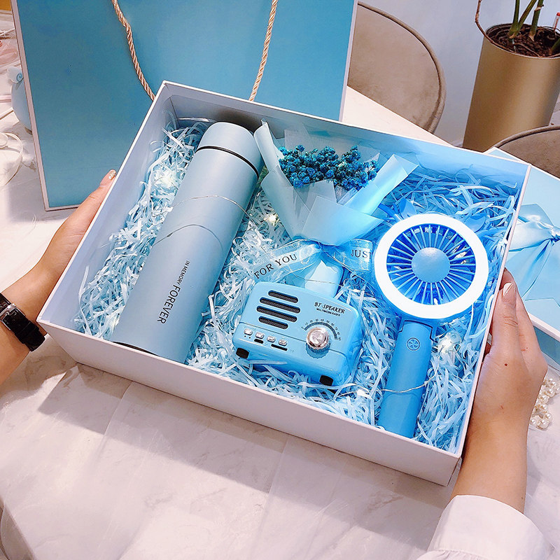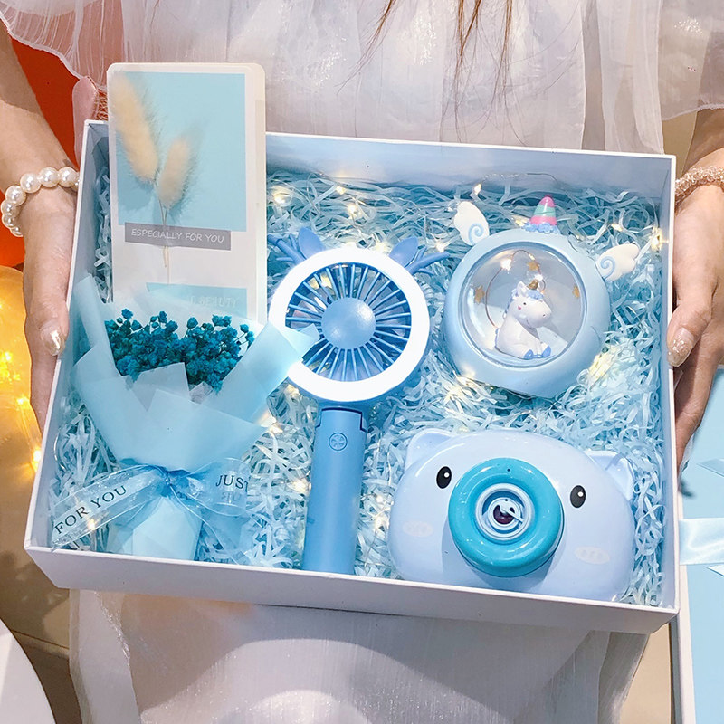 Blue set H (bubble machine, bouquet greeting card) Blue set D (bubble machine, fan, smart thermos cup, bouquet, greeting card) Blue set K (bubble machine, fan, intelligent insulation