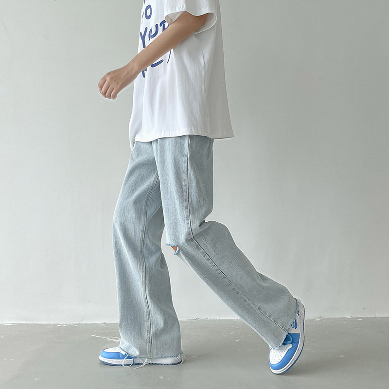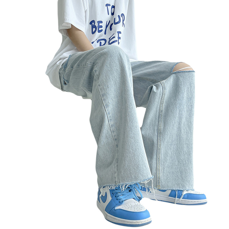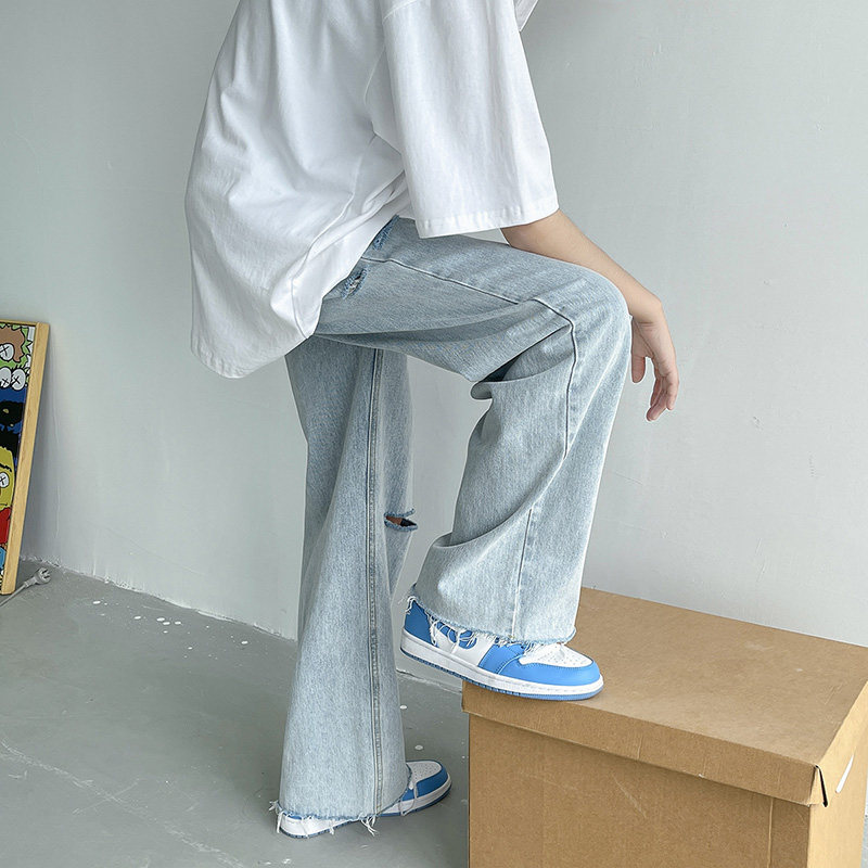 Ripped jeans boys spring/summer thin fashion brand loose straight leg versatile wide leg hong kong wind light color mop long pants