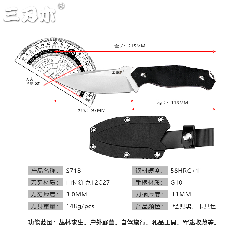 Triple-Edged Wood Outdoor Survival Cutter Field Courtwork Tactical Hunting Special Battle Anti-Body Sharp Open Blade High Hardness Straight Knife