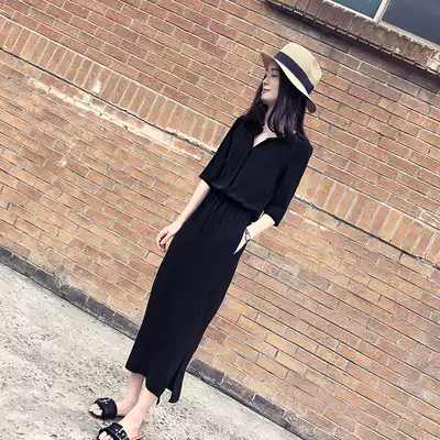 Black side fork dress women 2021 summer new Korean version Long version waist thin Hepburn style cheongsam skirt