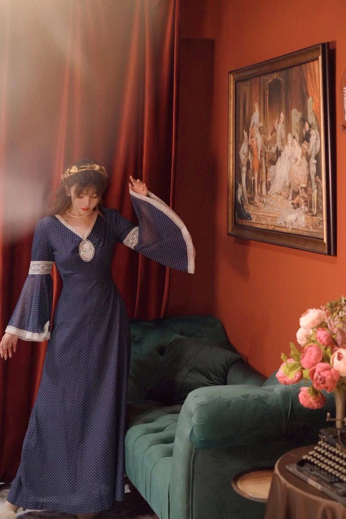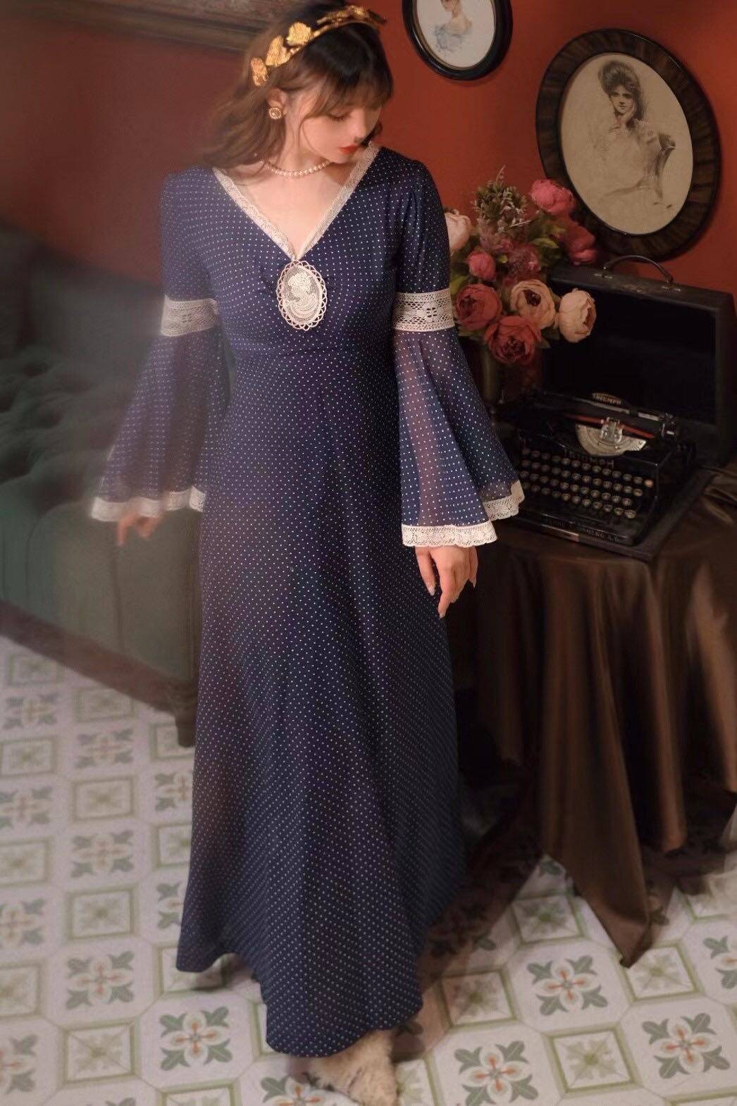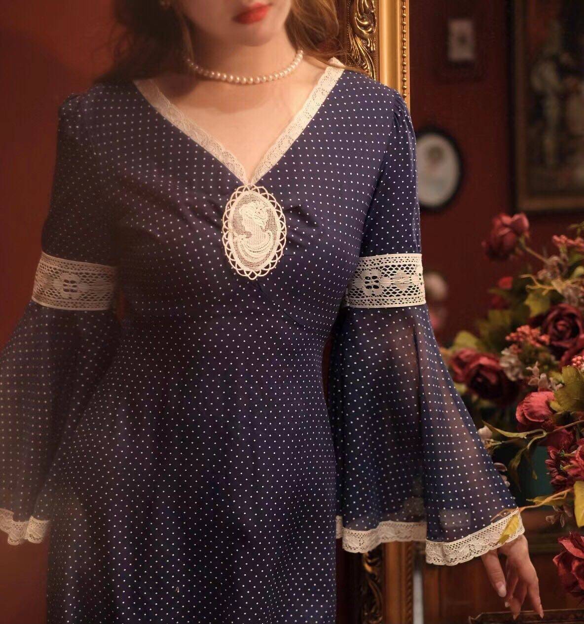 The Sleeping in Venus Sold 1970S Painted With Relief Embroidered Umbrella Handle Sleeves Navy Blue Polo Dot long skirt-Taobao
