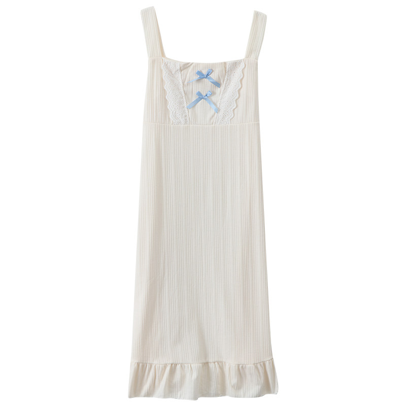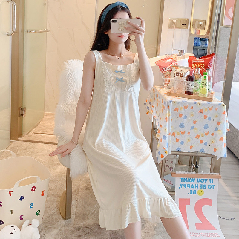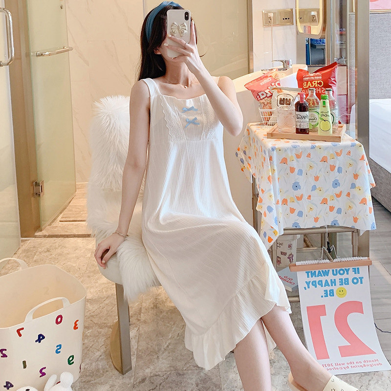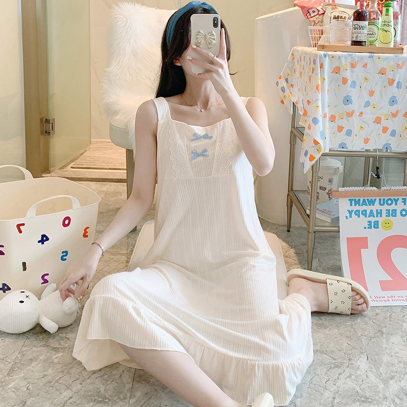 2021 New Sleepwear Women's Summer Pure Cotton Sweet And Cute Bow Tie Students Loose Princess Harnesses Sleeping Dresses
