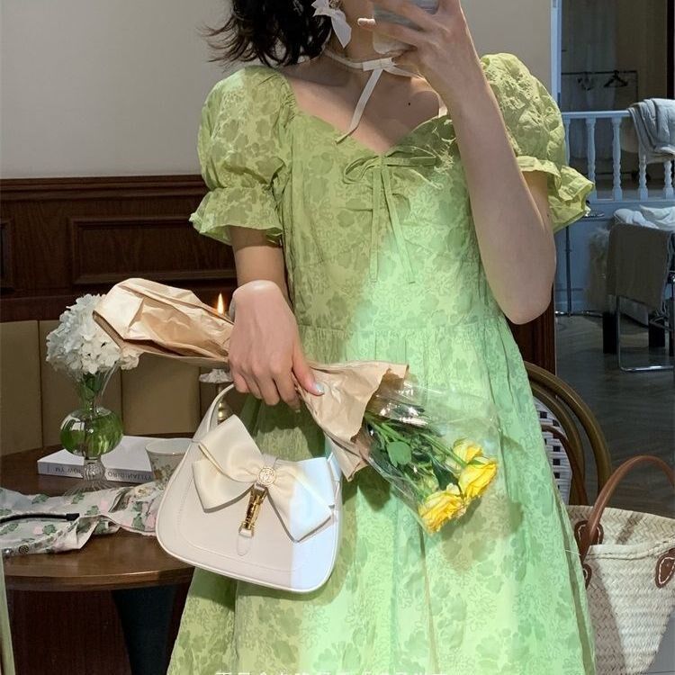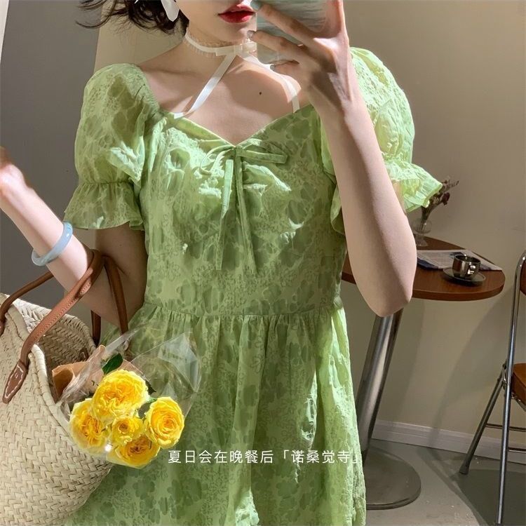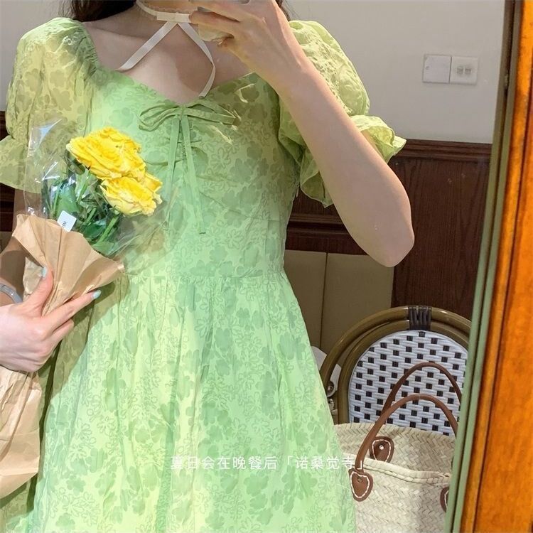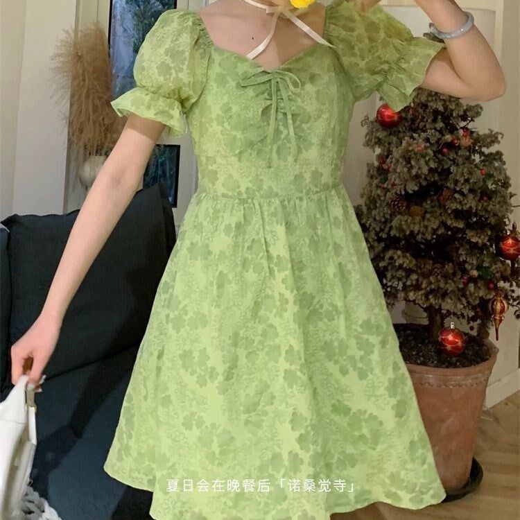 2022 Summer new student female collection waist display slim fit sweet and beautiful bubble sleeves green fairy Chopped Flowers Foreign Dress