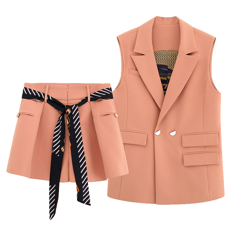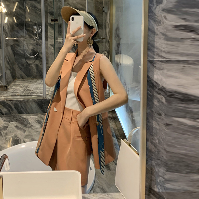 Beige vest, two-piece set of shorts (with silk scarf), orange-pink vest, two-piece set of shorts (with silk scarf)