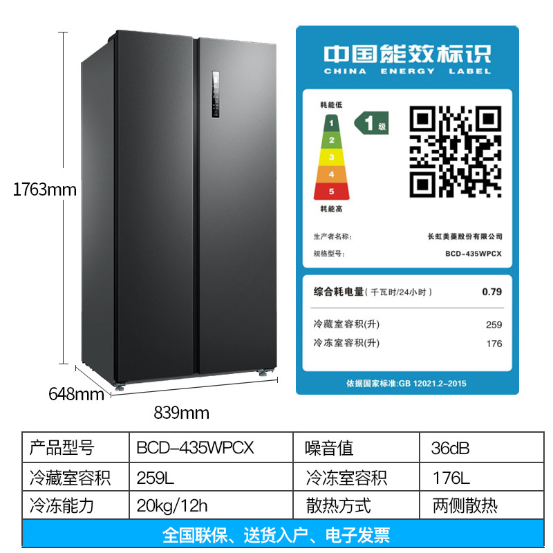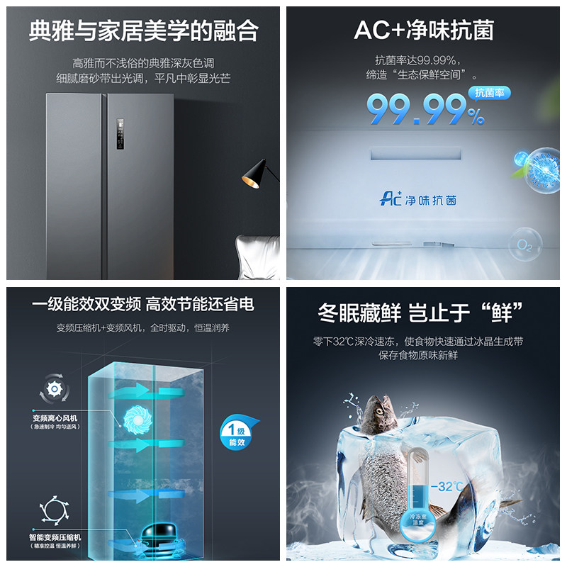 (Zhen Net) Mein 435L Domestic double switch pair open door frequency conversion level energy saving air-cooled ultra-thin fridge official