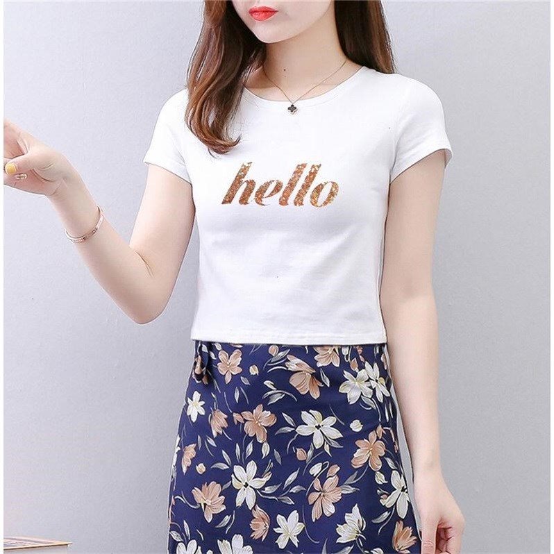 Round Collar T-shirt Woman Ins Tide 95 Cotton 2021 New Pure Color Short Sleeve Open-navel Short woman blouses slim and high waist
