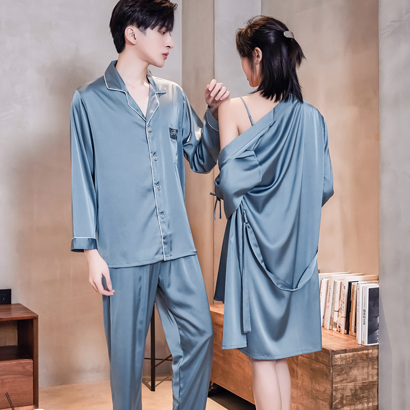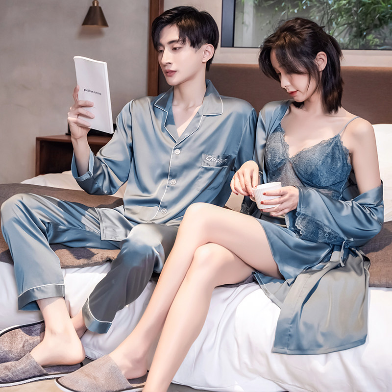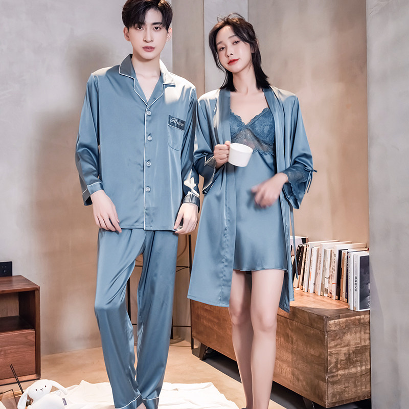 Summer lovers sleepwear long sleeves thin pieces of ice silk ladies lace sleepwear gowns men's large size relaxation home for the spring and autumn