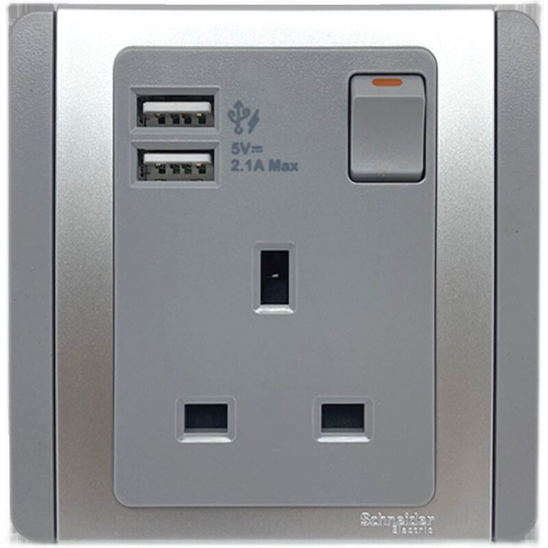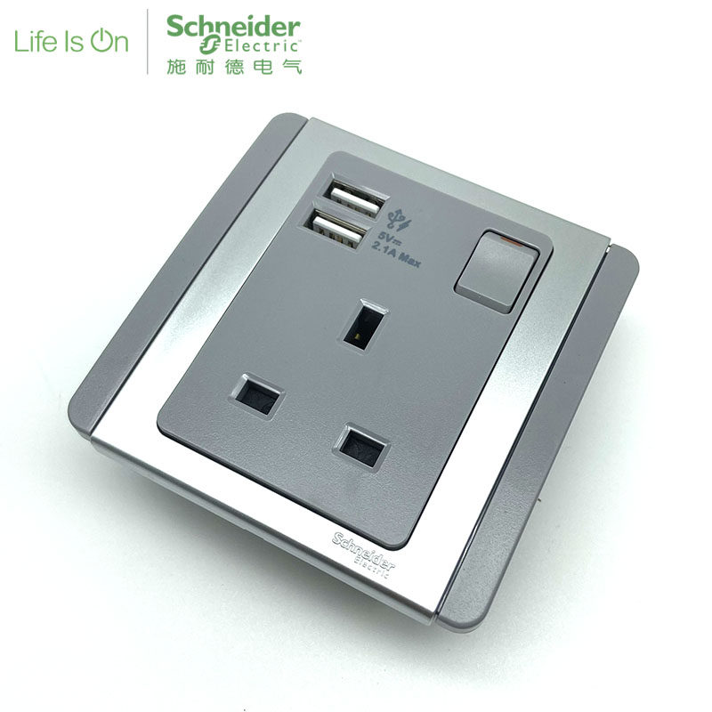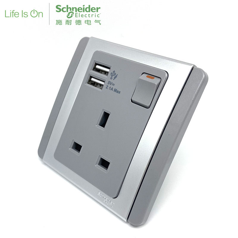 Schneider Switch Socket E3000 Silver Gray Open 13A Socket with Switch with Dual-mouth USB 2 1A