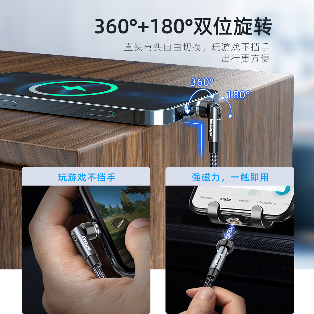 ESSAGER Yiesnew rotary magnetic data data wire Magnetic Force On-board Charging Wire Instrumental magnetic mobile phone Fast filling suitable for Apple Android Huawei three-in-one 3a flashover magnet type suction head