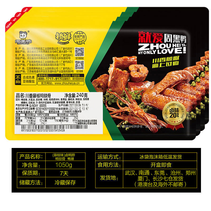 Zhouhei Duck Vine Pepper Duck Neck 300g Clavicle 240g*2 Boxes of Duck Wings 240g Locked Fresh Atmosphere Boxed Wuhan Specialty