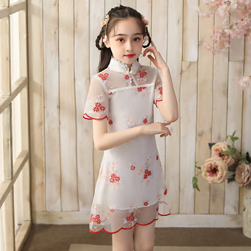Children's cheongsam girls Chinese style autumn middle and big children ancient style Tang suit little girl lace short thin section dress