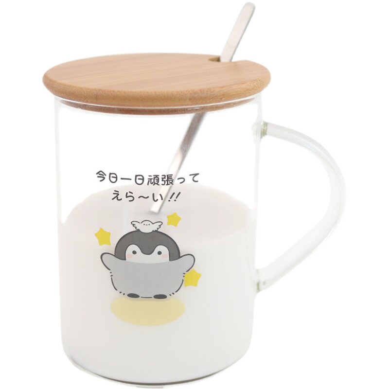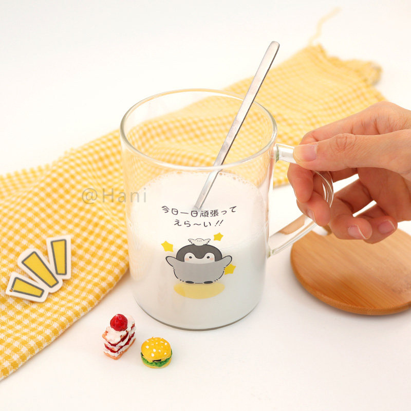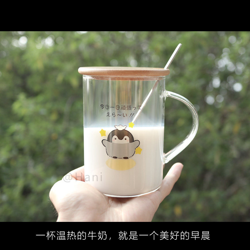 Original Penguin Glass cup Hani day series water glasses milk cup mark cup with cover with spoon office coffee cup-Taobao