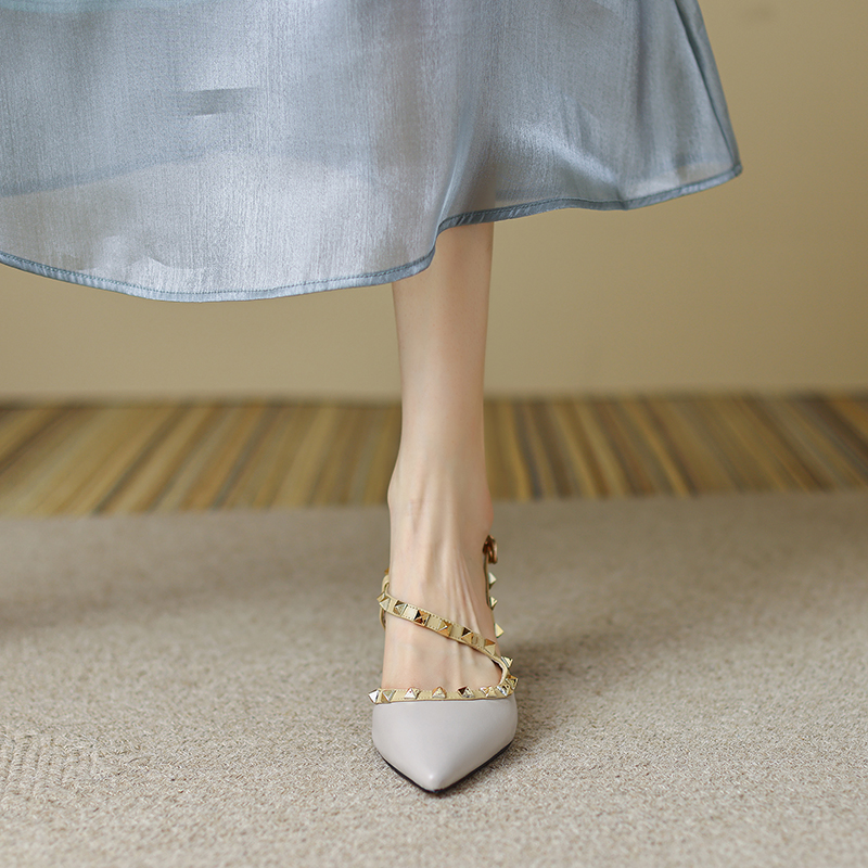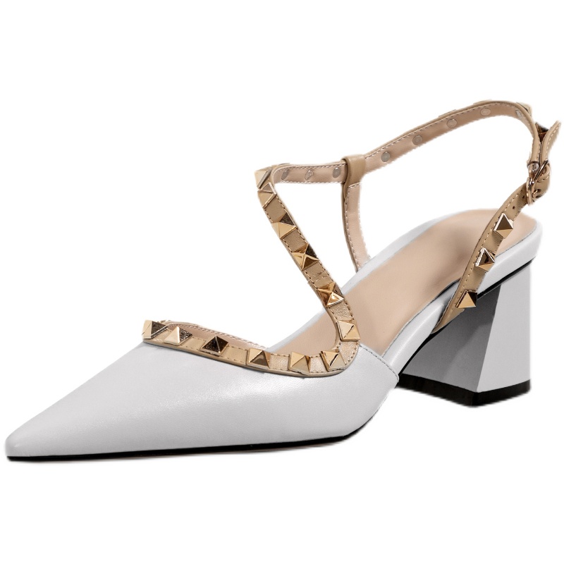 KAKY high-heeled shoes women's 2022 summer new Baotou rivets thick heel leather word with niche sandals pointed toe