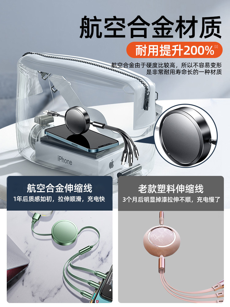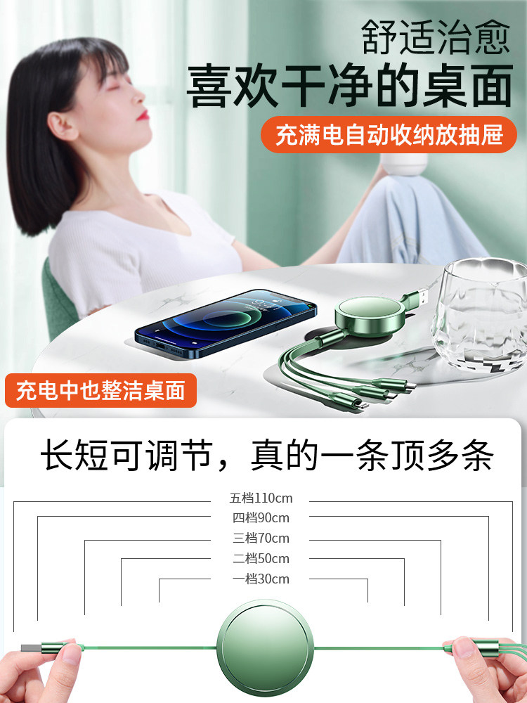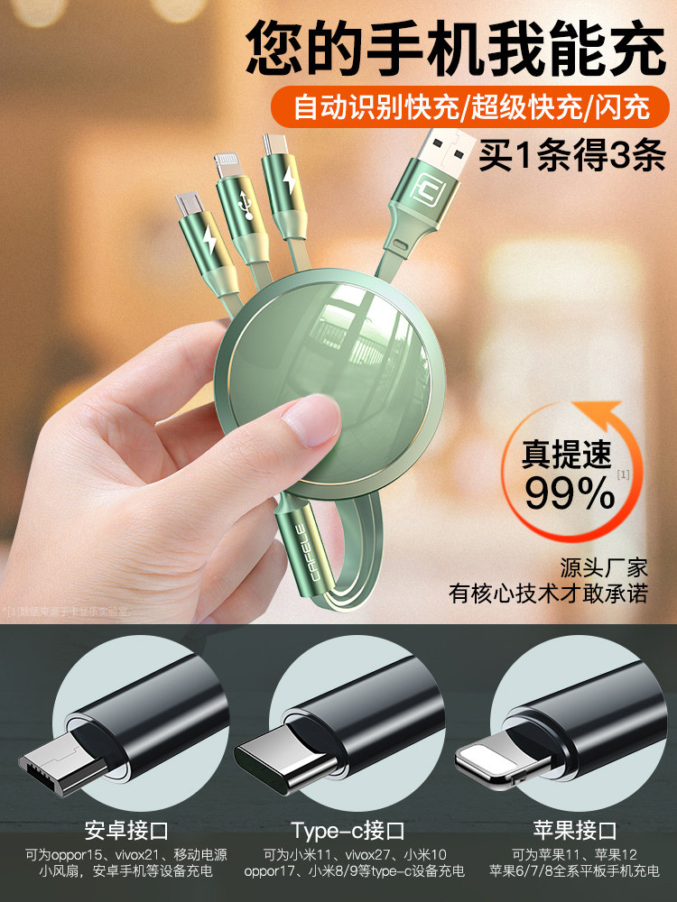Data line three-in-one triple head 5a retractable portable flash lengthened charging line applicable Apple 11typec Huawei iPhone Android mobile phone ipad multifunction short one drag triple quick charge